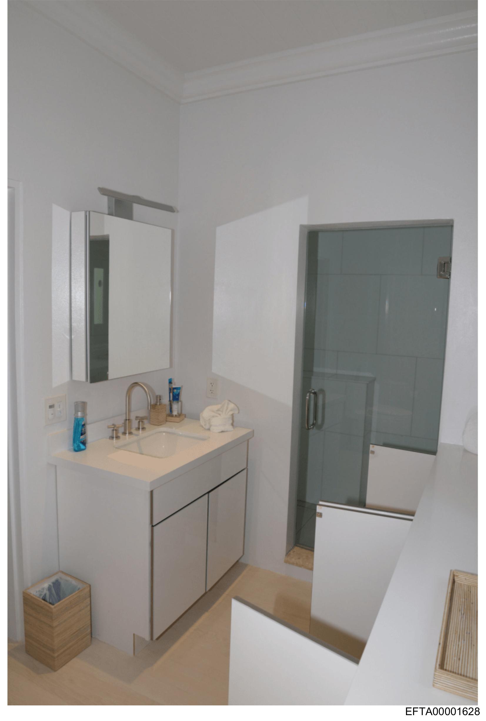 The image shows a well-lit bathroom with a simple yet tidy appearance. In the foreground, there is a sink with a mirror above it, and to the right of the sink, there's an open glass shower door revealing an empty shower area. On the left side, below the mirror, there are various items including what appears to be toiletries and possibly decorative objects. A basket or small shelf beneath the sink is also visible. The color scheme consists of light colors, giving the room a clean and airy feel. There's no text present in the image.