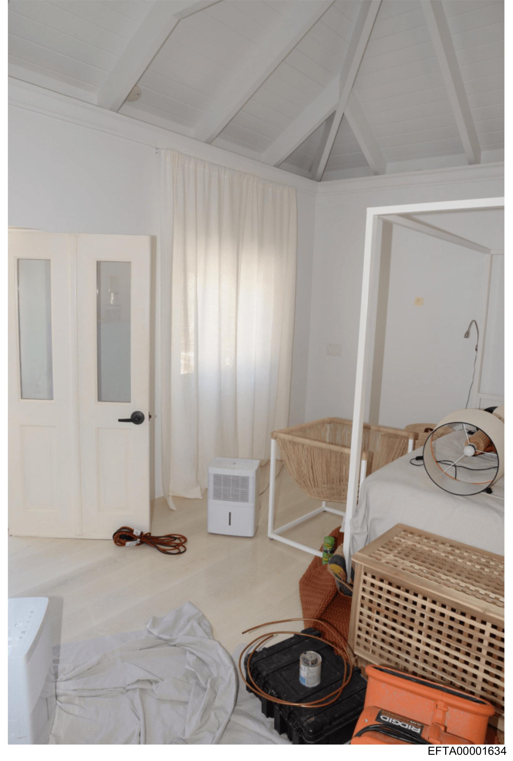 The image depicts a room undergoing renovation with a focus on the flooring work.