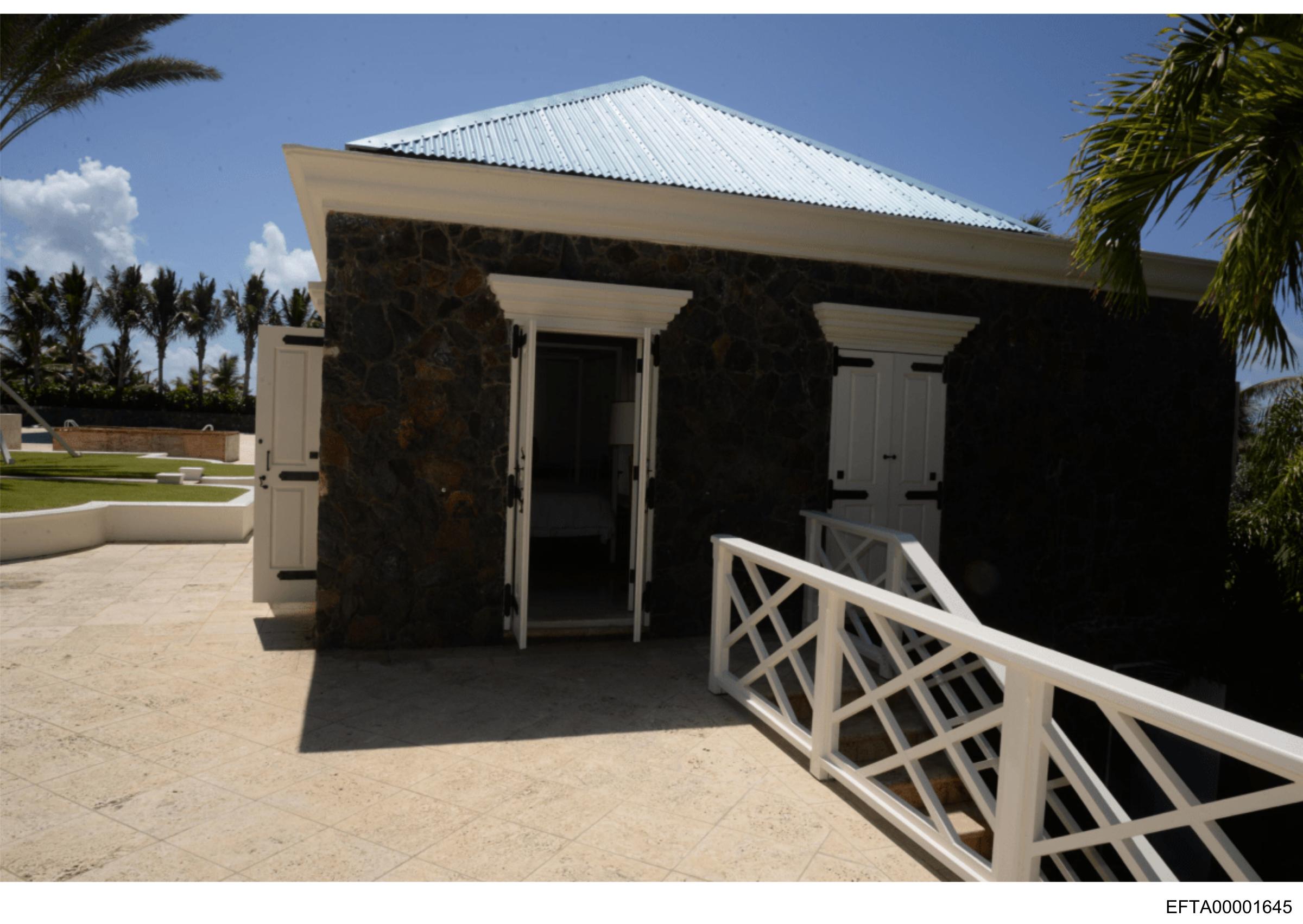 The image depicts a quaint stone building with a blue roof and a white railing that appears to be part of a balcony or walkway leading up to the structure. The building has a single entrance door flanked by what seems to be windows, all closed and secured. The sky above is clear, suggesting good weather, and there are palm trees visible in the background, indicating a warm climate location. There's no text present in the image, nor any people or animals that can be discerned with certainty. The style of the architecture, coupled with the tropical vegetation, suggests this might be a structure found near a beach or in a resort area.