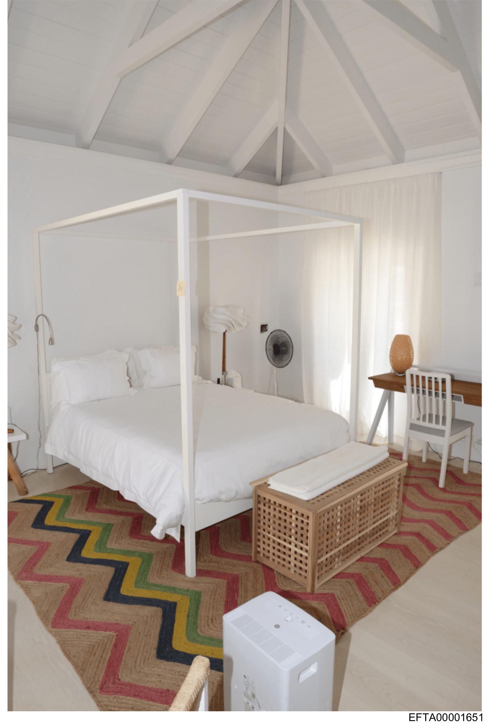 The image shows an interior room with a four-poster bed at its center. The bed has white linens and is covered by a mosquito net. To the left of the bed, there's a wooden nightstand with a lamp on top. In front of the bed, there is a woven basket placed on what appears to be a small stool or table. The room features a high ceiling with exposed beams painted white. The flooring has a chevron pattern consisting of multicolored stripes, adding a vibrant touch to the otherwise neutral space. On the right side, part of an air conditioning unit is visible, suggesting that the room is equipped for climate control. There are no texts or people in the image. The overall style of the photograph seems candid, possibly taken for real estate or interior design purposes.