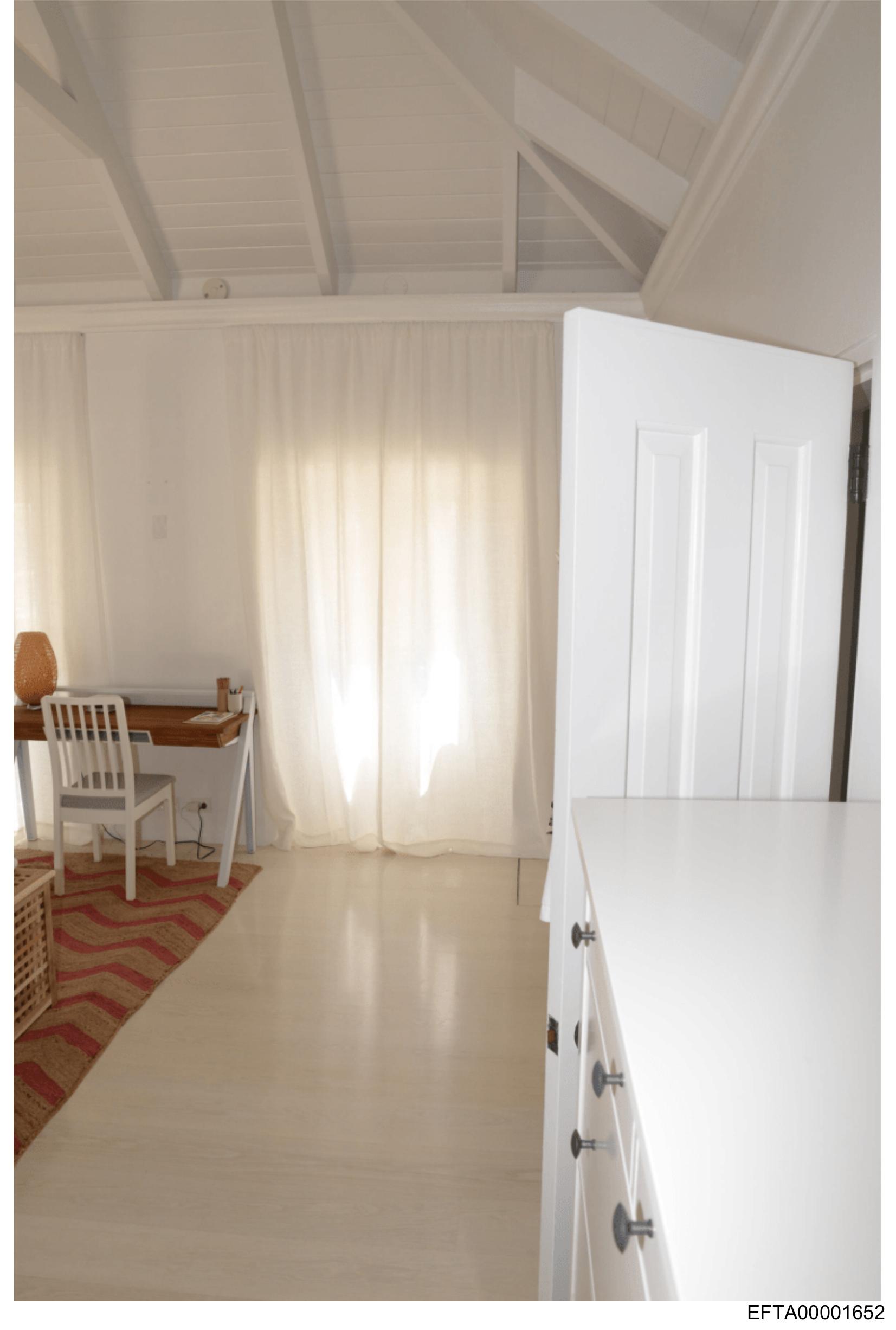 The image shows an interior room with a minimalist design. There is a white kitchen cabinet to the right side of the frame. In the center of the room stands a dining table set for two, with placemats and plates arranged neatly on top. To the left, there's a portion of a patterned area rug partially visible under a chair. The flooring appears to be polished wood, reflecting the light in the room. A large window is present behind the dining table, adorned with white curtains that let in natural light, illuminating the space. There are no visible texts or people within this image.