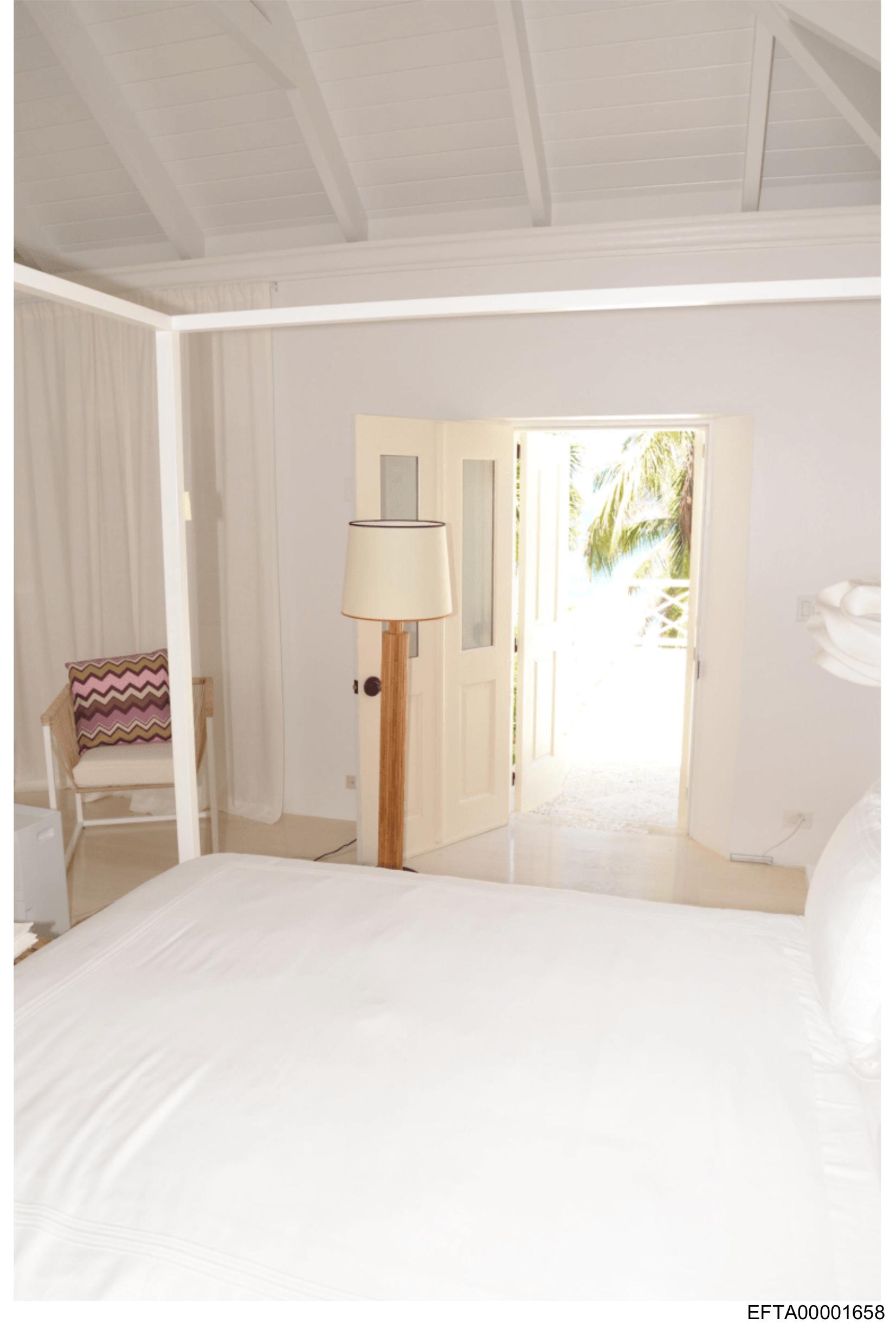 The image depicts an interior space that appears to be a bedroom with a large bed dressed in white linens and pillows. To the right of the bed, there is a doorway leading outside where bright daylight illuminates a view of palm trees, suggesting a tropical location. The room features a vaulted ceiling with exposed beams, painted white like much of the interior, which creates a spacious and airy feel. On the left side of the room, next to the foot of the bed, there is a floor lamp with a cylindrical shade that matches the room's minimalist aesthetic. The door leading outside has frosted glass panes allowing diffused light into the room but obscuring the view from inside. There are no texts visible in the image.
