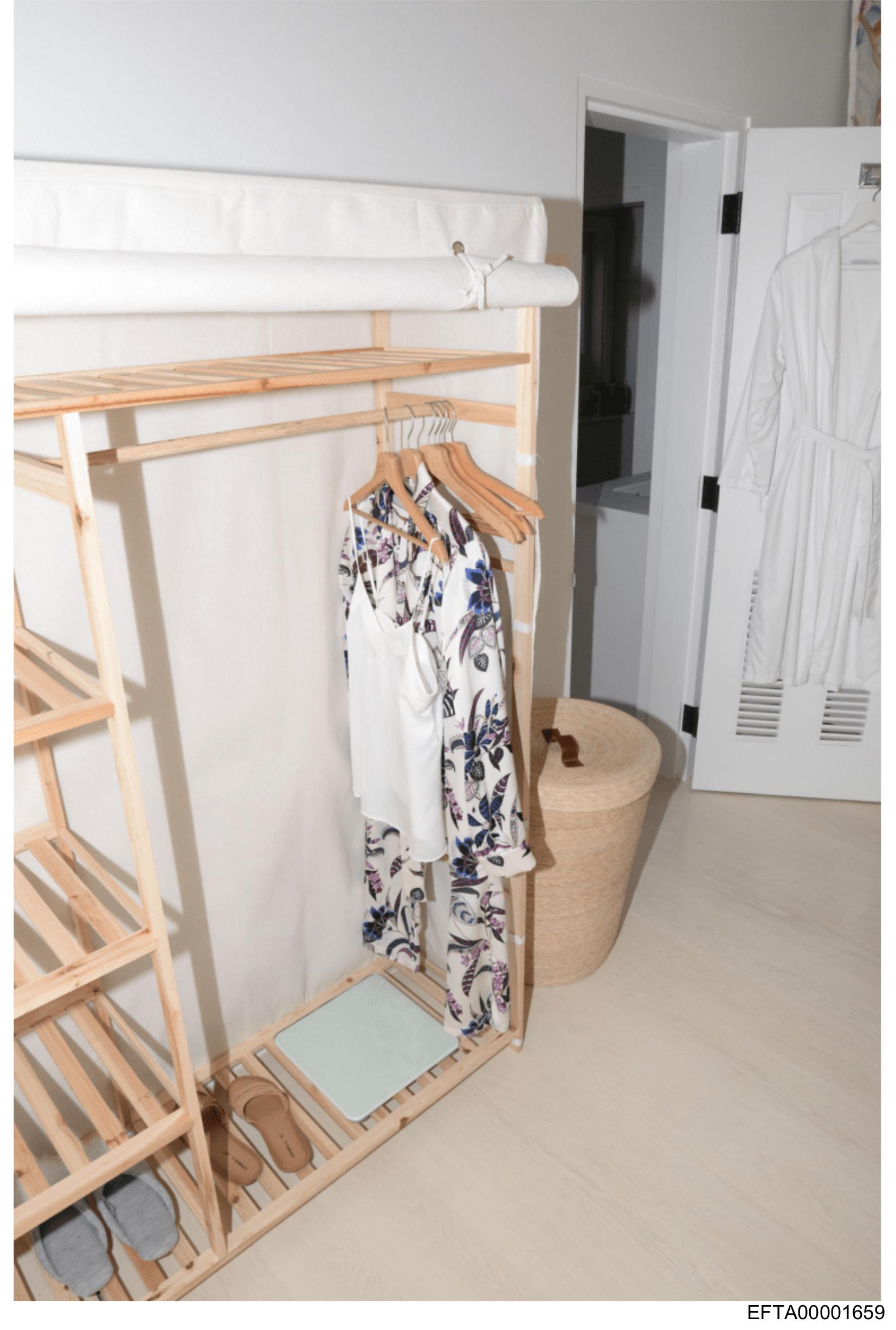 The image shows an indoor setting with a wooden shelf against a white wall. On the shelf, there is a folded garment that appears to be a floral print dress. Below this, on the bottom shelf, various items are neatly arranged, including what looks like shoes and possibly some small household objects or accessories. The overall scene suggests a well-organized storage area in a home or personal space. There's no visible text or identifiable people in the image.