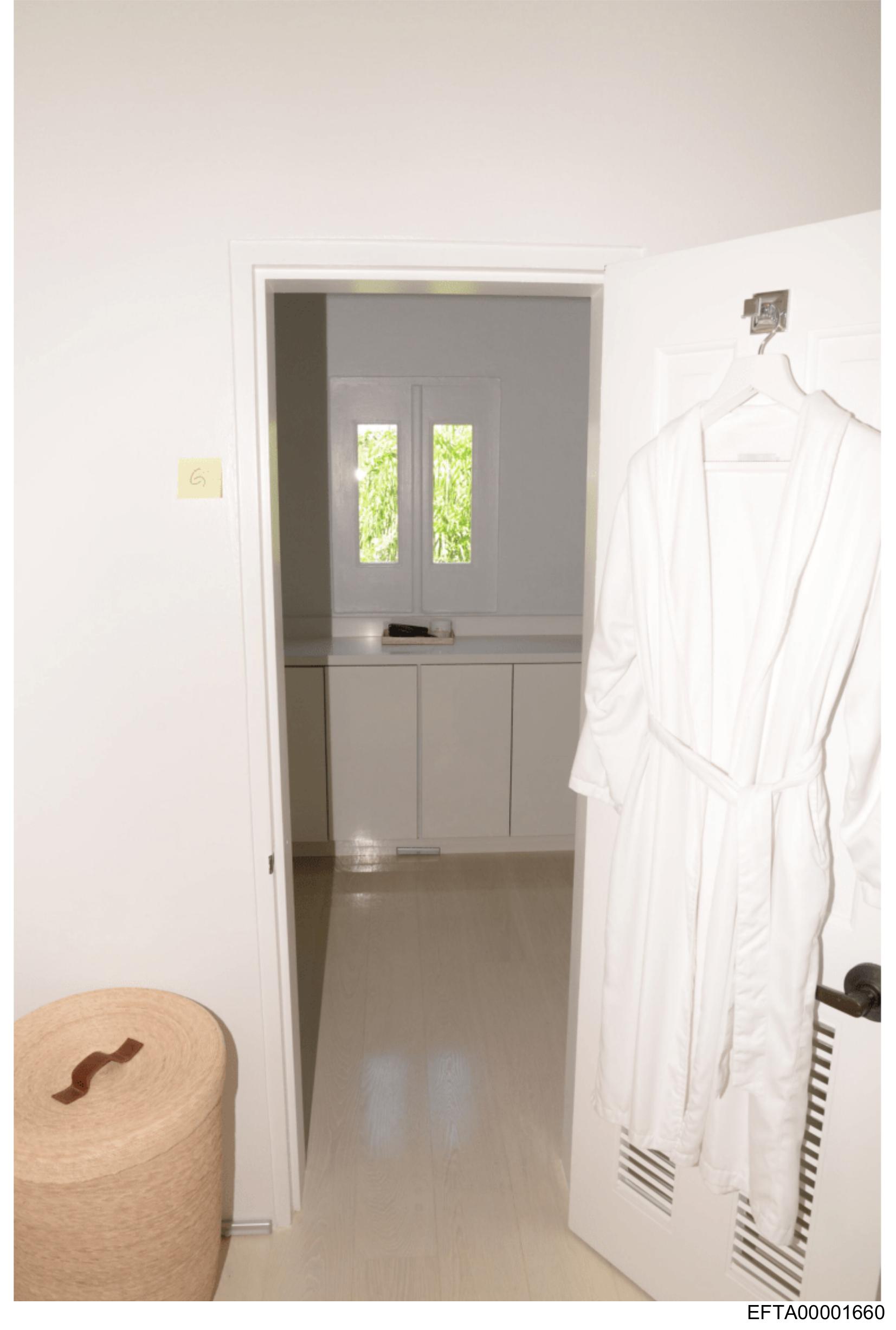 The image shows an interior space with a door partially open, revealing a hallway that leads to another room in the distance.