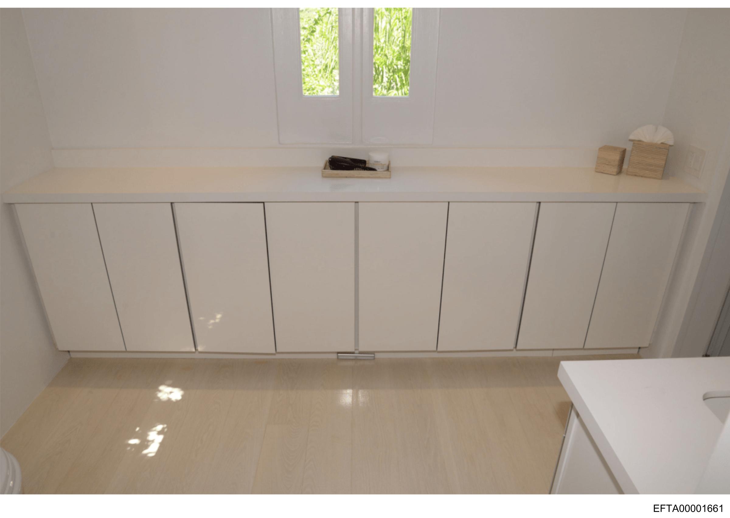 The image shows an interior view of a kitchen cabinet system with several doors. The cabinets are white and appear to be made of a light wood material or laminate. Above the cabinets is a countertop that seems to have some items on it, but they are not clearly visible due to the angle and distance from the camera. The floor beneath has tiles that reflect light, suggesting a glossy finish. To the right side, part of a kitchen appliance can be seen, likely part of the stove or oven range, but it is only partially in view, with its color matching the cabinets. There are no texts visible in this image. The style of the photograph seems to be candid and possibly taken by someone interested in showcasing the cabinetry design rather than for artistic purposes.