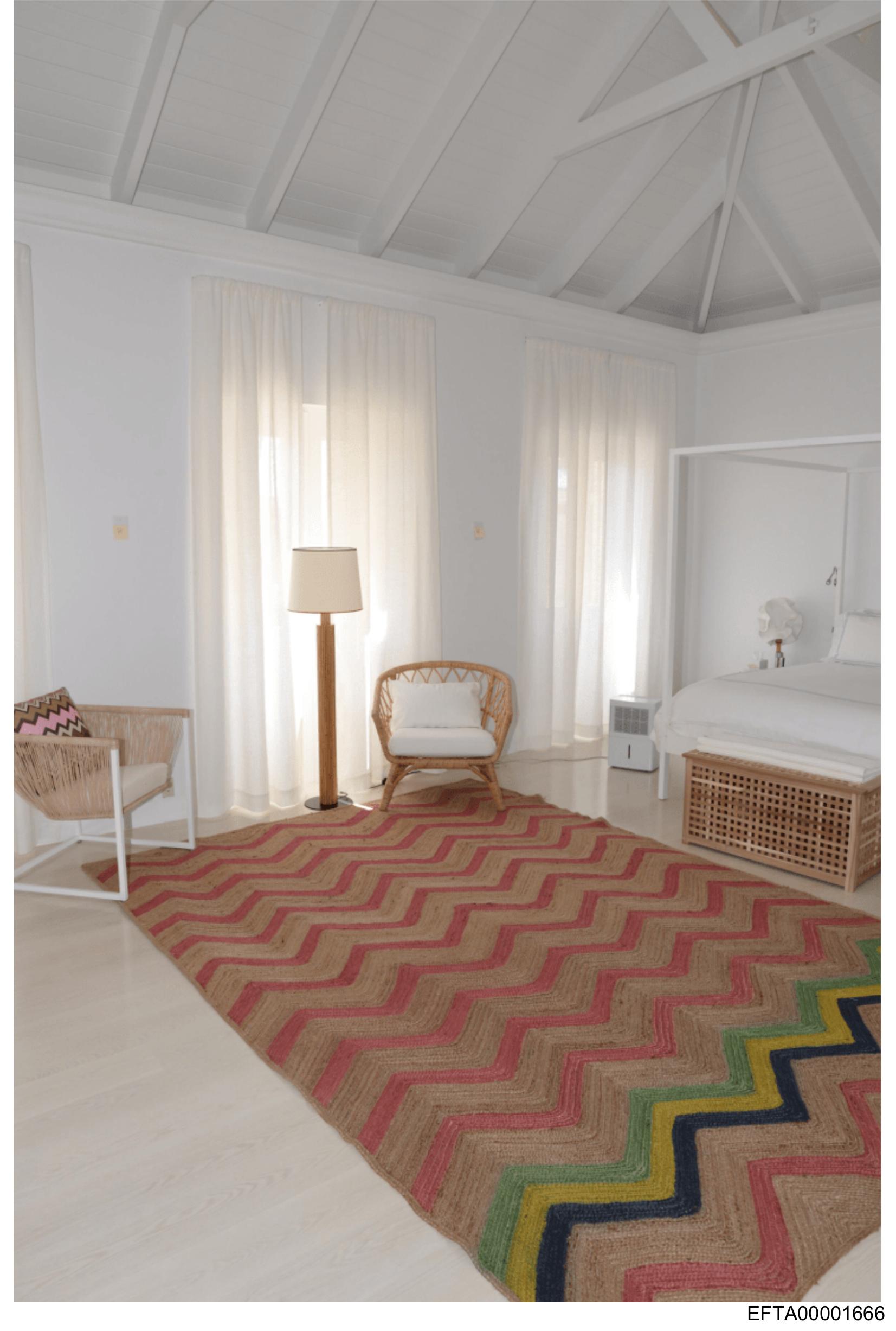This is an interior photo of a room with high ceilings and exposed wooden beams. The flooring features a vibrant, multicolored area rug with geometric patterns. To the left, there's a comfortable-looking armchair in front of a small table with a lamp on it. On the right side of the image, a large bed is partially visible behind another piece of furniture, possibly a nightstand or dresser. The room appears to be well-lit with natural light coming through sheer curtains that are drawn back from the windows. There is no visible text in the image.