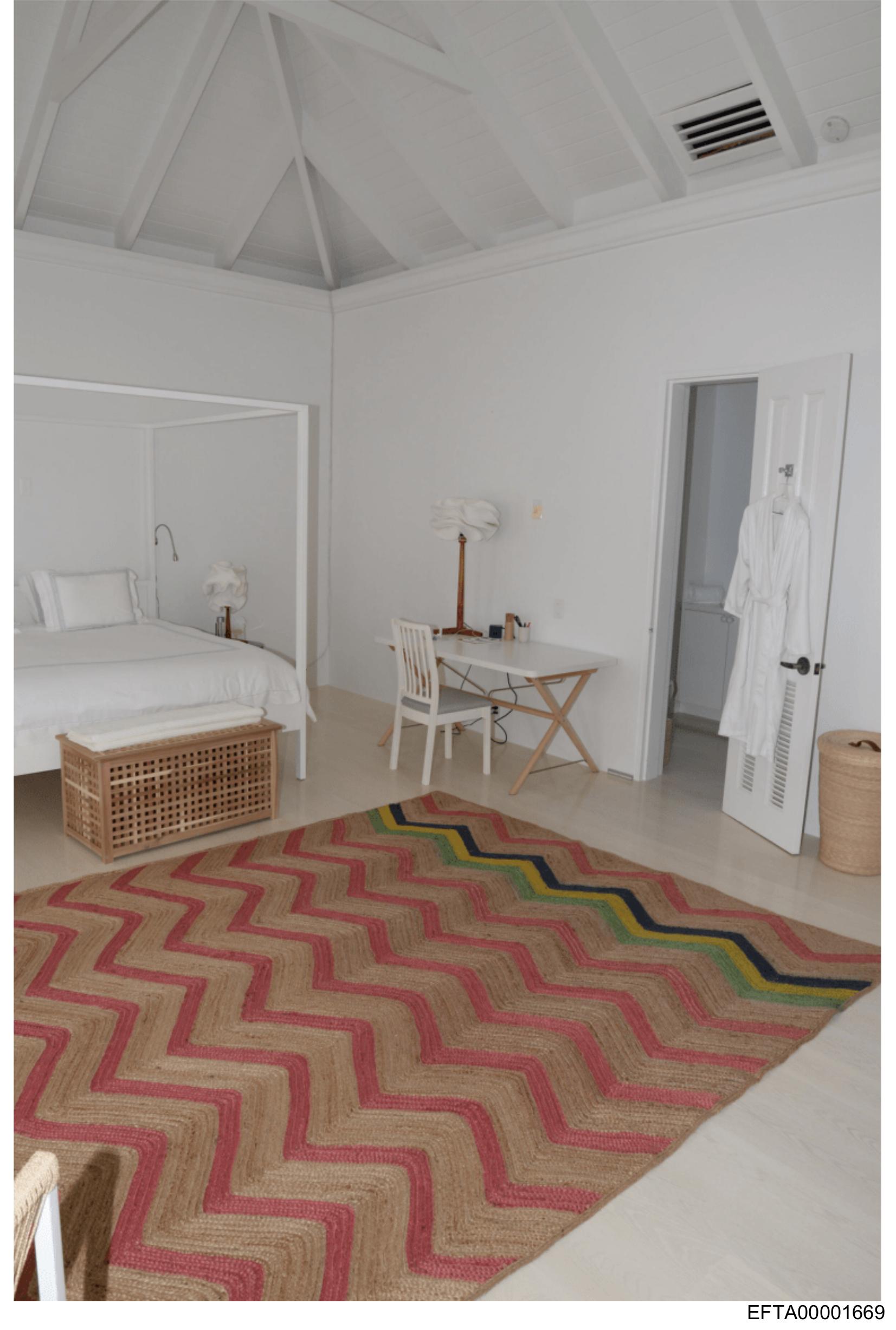 The image shows a bedroom interior with a focus on the floor. The room has white walls and ceiling, which contrasts with the colorful patterned rug that covers most of the floor area. The rug features bold geometric shapes in shades of red, orange, yellow, and brown. In the foreground, there's a portion of a bed covered with light-colored bedding. On the left side, partially visible, is an armchair with a wicker design and a wooden base. To the right, there is an open door leading to another room or hallway. The overall ambiance suggests a clean and modern decor style. There are no texts or people present in the image.