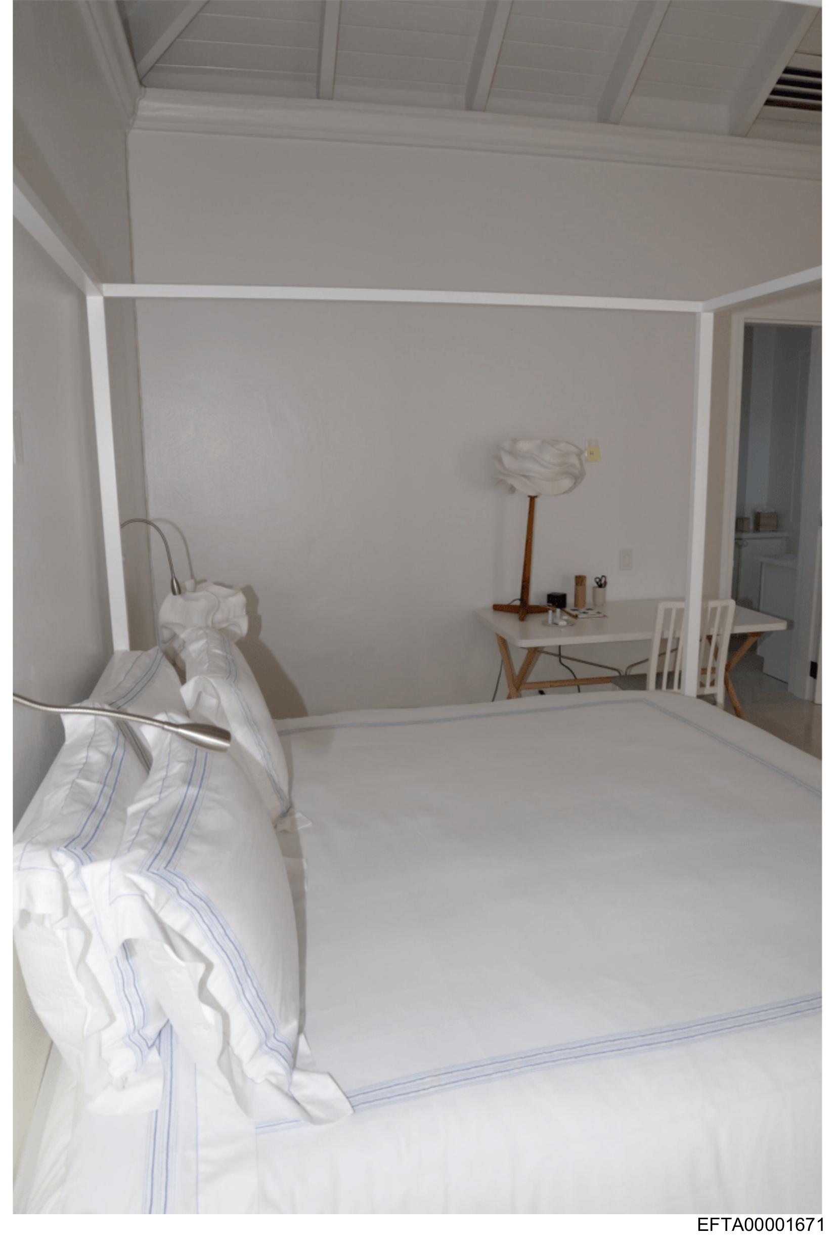 This is an image of a bedroom interior. The room features a large bed with a white bedspread and matching pillows. Above the bed, there's a canopy frame that appears to be made of wood. To the right side of the bed, there is a wooden chair with a light source on top, possibly a lamp or a reading lamp. On the wall behind the bed, there are two framed pieces of art or decorations hanging above a doorway. The room has white walls and a ceiling from which various fixtures hang, including what looks like air conditioning vents. There's no visible text in the image.