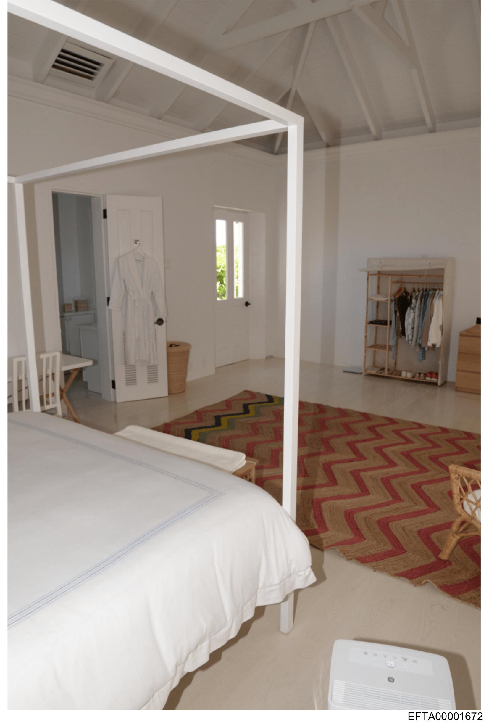 The image shows a room with high ceilings featuring wooden beams and a white ceiling. The focal point of the room is a four-poster bed dressed in crisp linens. In front of the bed, there's a patterned rug that adds a touch of color to the space. To the right, you can see part of a nightstand with what appears to be a lamp and some books on it. The overall style of the room suggests a blend of traditional and contemporary design elements.