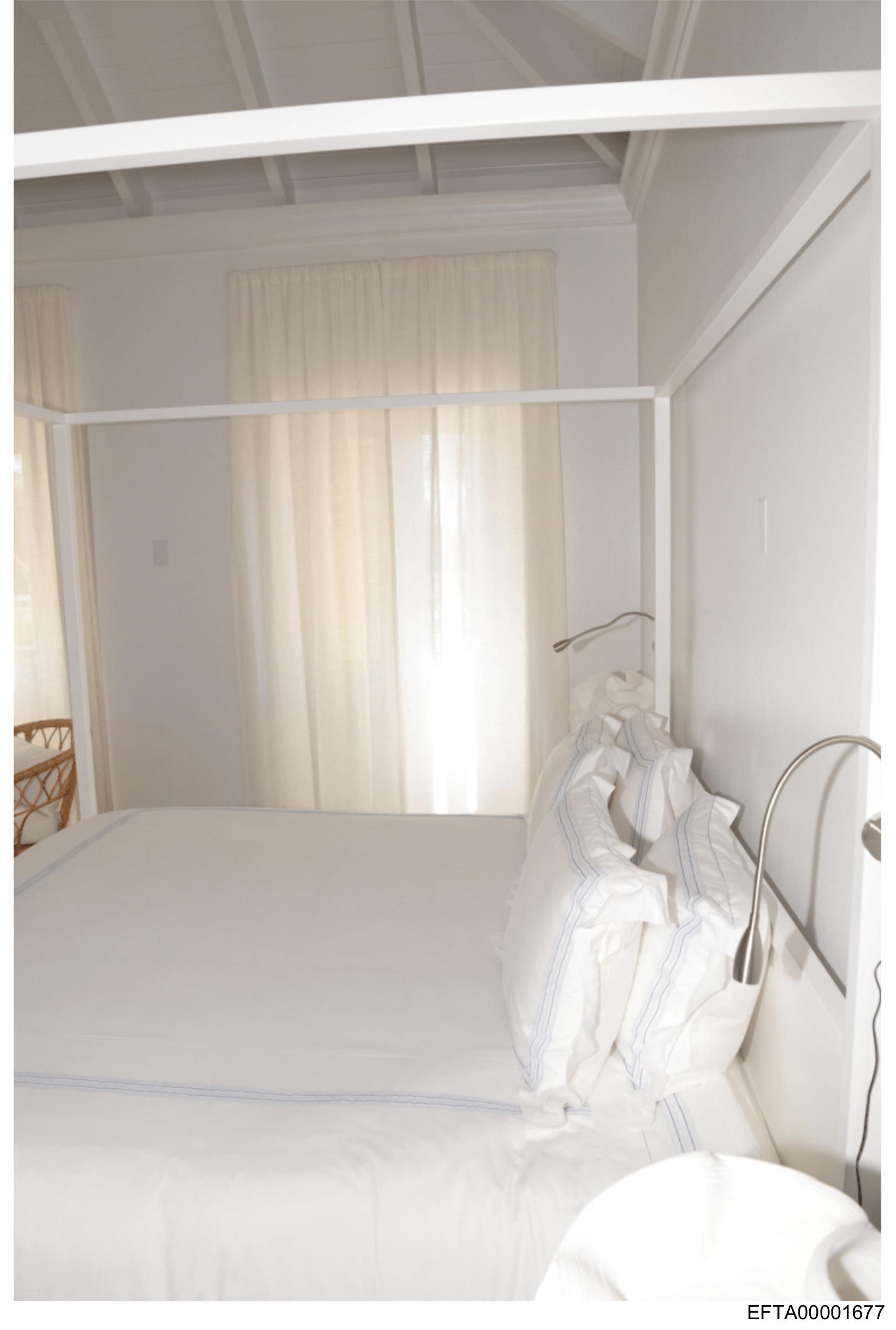 The image shows a bedroom interior with a neatly made bed in the foreground.