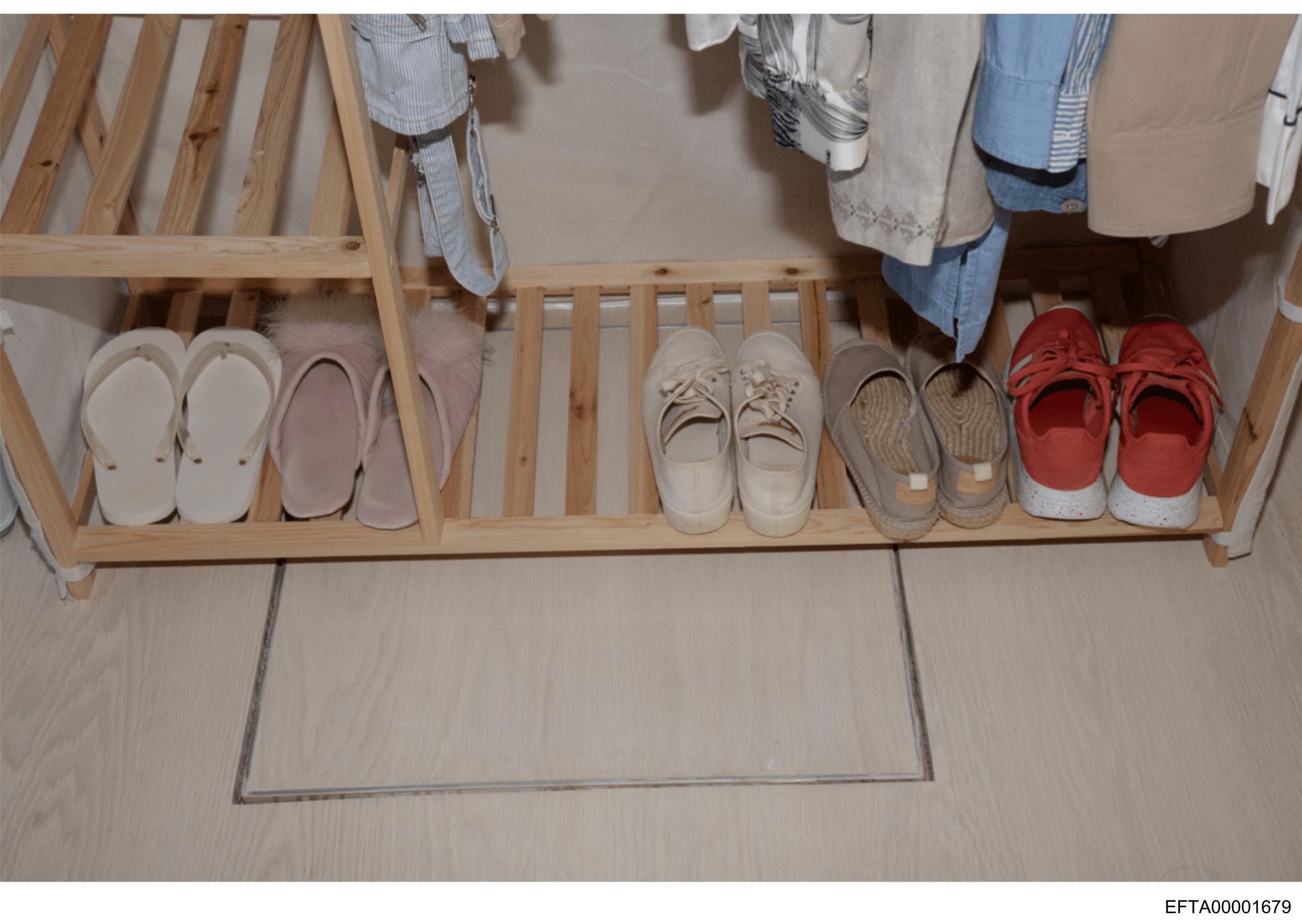 The image shows an organized closet with multiple wooden shelves. On the top shelf, there are a few items of clothing hanging; however, it's not clear what they are due to the angle and distance from the camera. Below this, on the second shelf, there is a collection of shoes neatly arranged in rows. From left to right, there are at least six pairs of different styles and colors visible, including shades of brown, red, white, and beige. The room has a plain wall behind the shelves, and there's no text or people present in the image. The overall atmosphere appears neat and orderly.