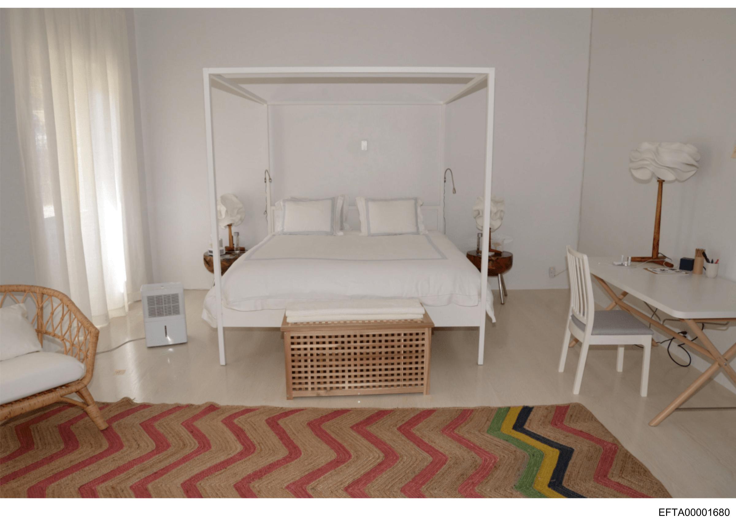 The image shows an interior space with a large, white canopy bed as the central focus.