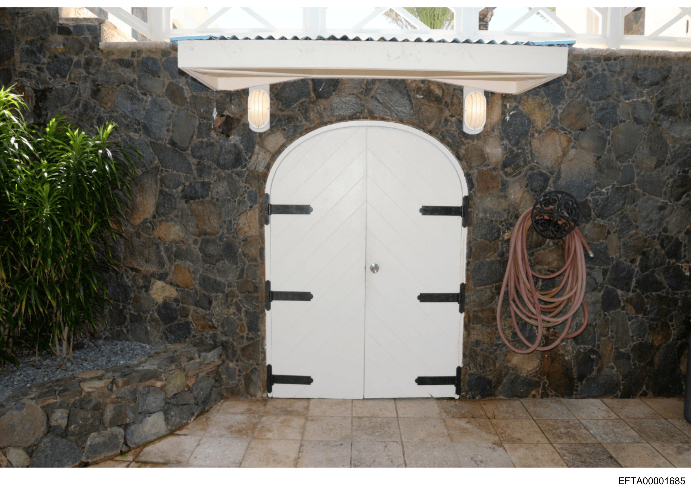This is a photograph depicting an arched doorway with white doors framed by what appears to be a dark stone wall, possibly a part of a building facade. Above the archway are two light fixtures turned off. To the left of the image, there's a green cord or cable attached to something that isn't fully visible; it could be an electrical appliance or equipment related to maintenance work. The environment suggests an outdoor setting due to the natural stone and sunlight casting shadows on the ground. There is no text present in the image.