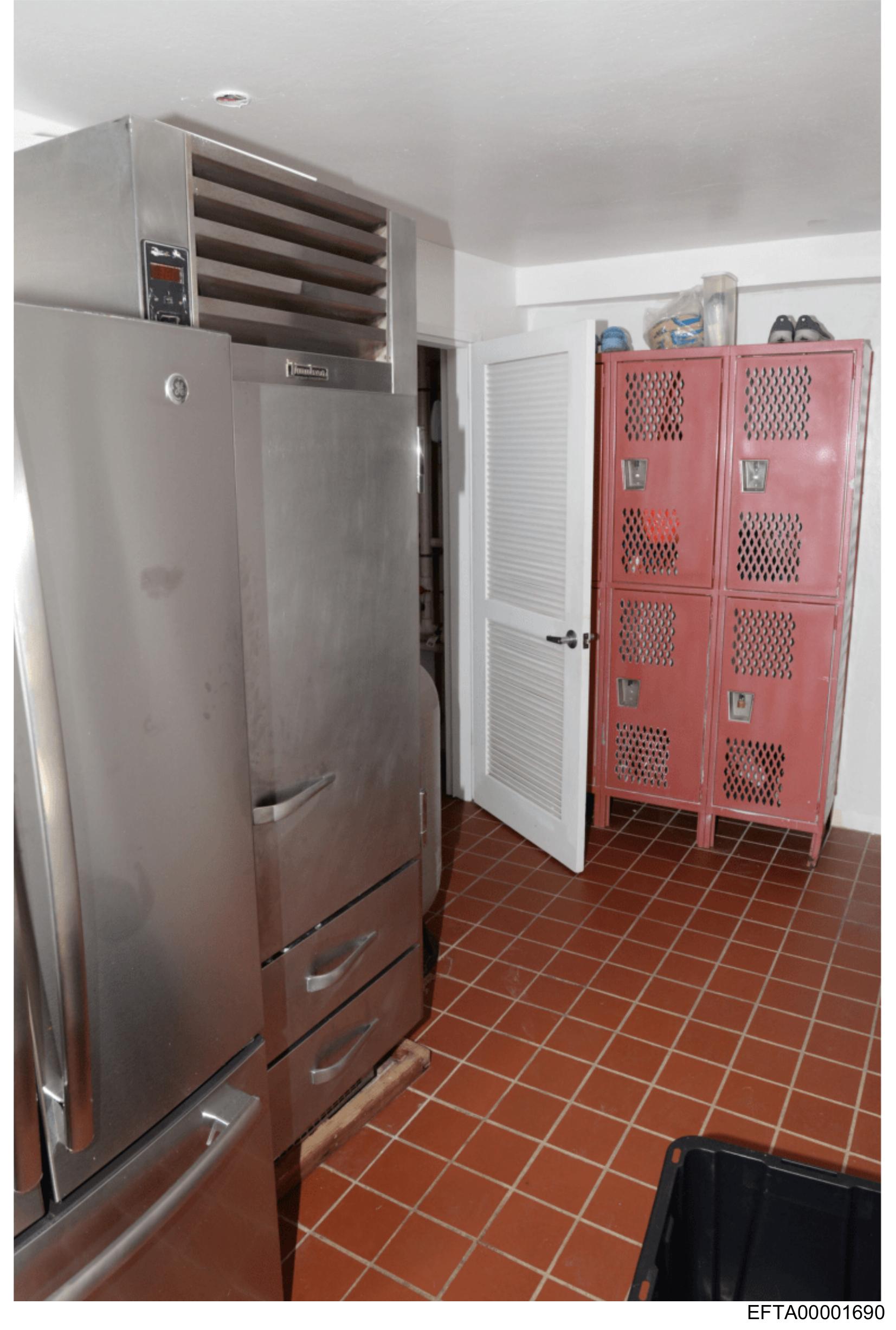 The image shows an interior room with various pieces of industrial kitchen equipment and storage units. On the left side is a large stainless steel refrigerator with its door closed. Adjacent to it, there's a tall, open metal cabinet with shelves that are currently empty. To the right, a red locker unit with multiple compartments can be seen, again appearing vacant. The floor is tiled in a dark color, possibly black or dark brown. There is no visible text in the image, and no people are present. The overall setting suggests this might be a commercial kitchen space.