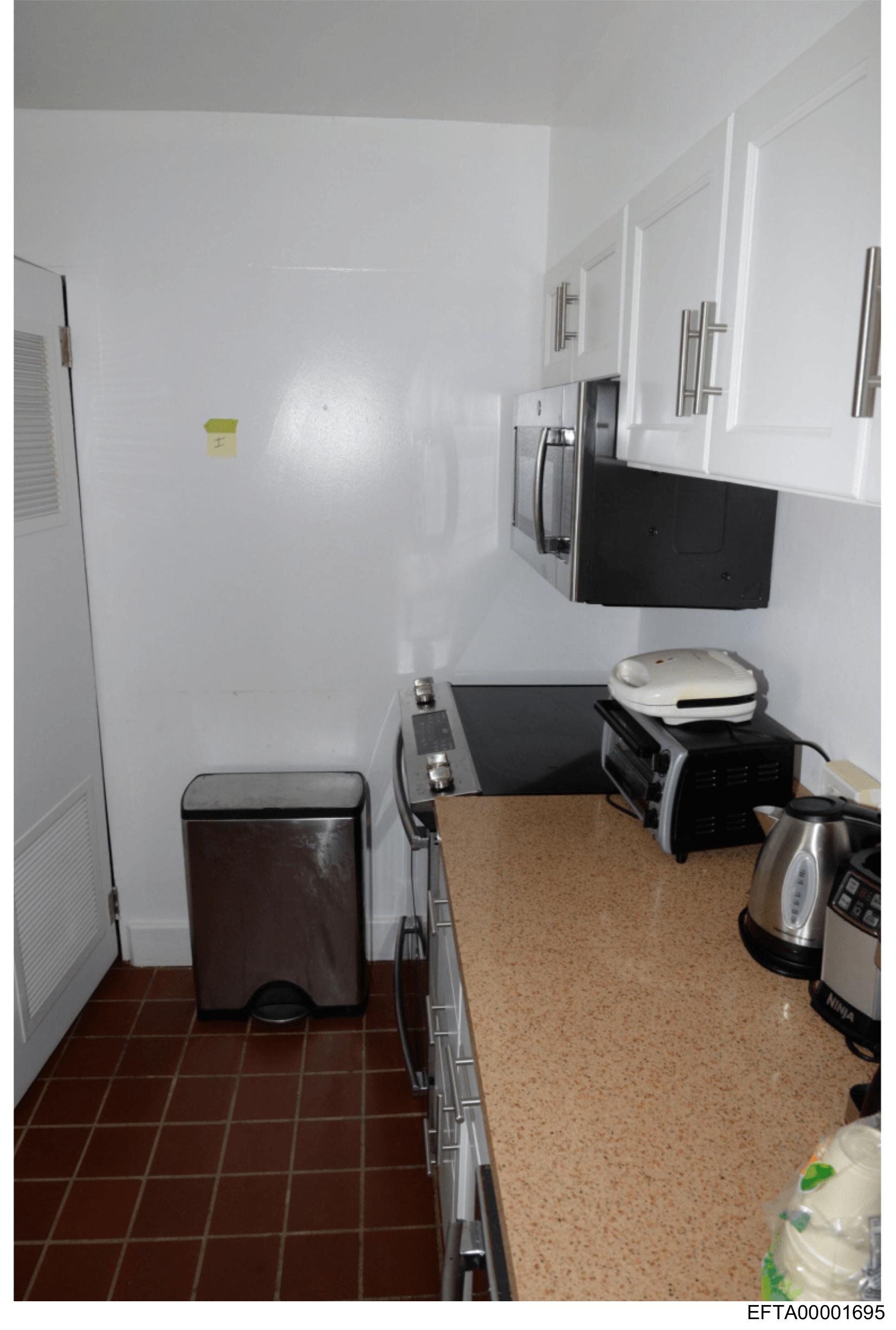 The image depicts a compact kitchen area. On the left side of the frame, there is a trash can with its lid open, next to what appears to be an empty corner where the wall meets the floor. The countertop, which has a speckled surface in muted colors, extends across most of the image and features two appliances: a small refrigerator on the right and a microwave above it. There is also a sink with a faucet on the countertop. The kitchen's back wall has a window with a white frame that allows natural light into the space. The floor consists of reddish tiles, adding a warm tone to the room. There are no visible texts or people in the image.