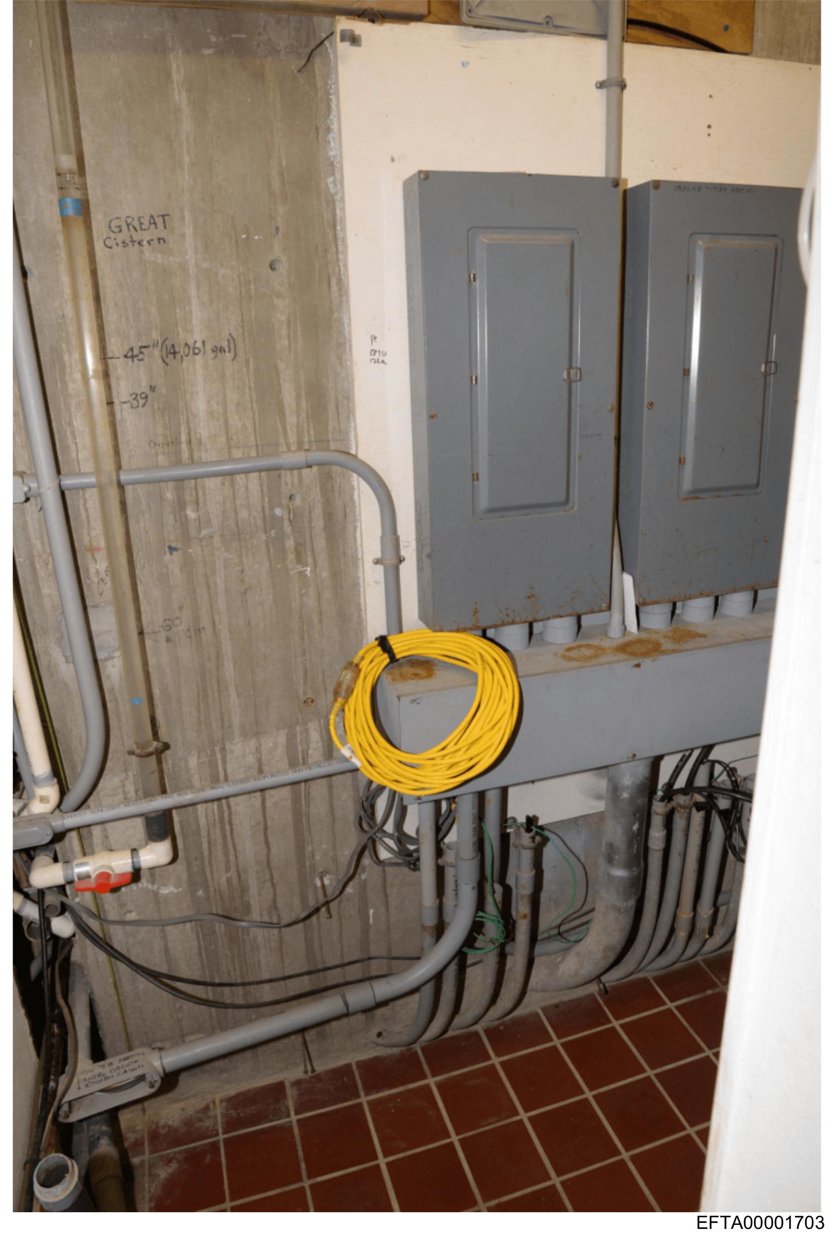 The image captures a view of an electrical room, where the focus is on two main elements: a gray electric meter and a yellow conduit.