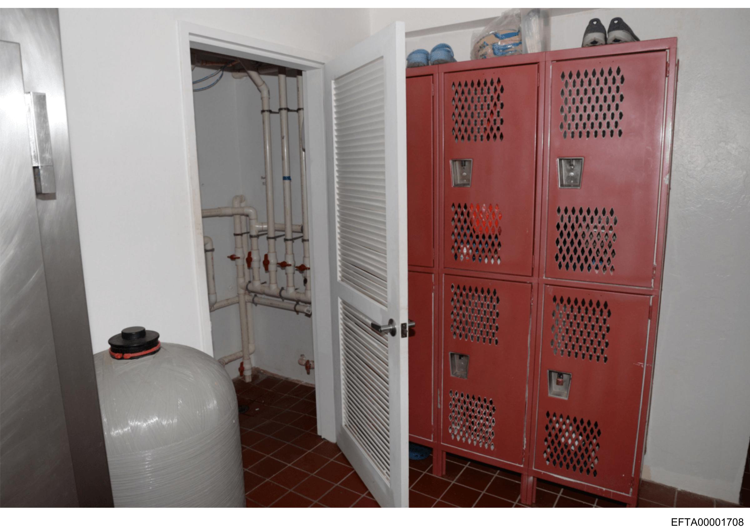 The image shows an indoor space that appears to be a storage area or locker room. On the left side of the frame, there's a white door with a ventilation grate on it and visible pipes running across the ceiling behind it. The central part of the image features three red metal lockers stacked vertically; each locker has multiple compartments and is secured with padlocks. There are no people visible in the image. In terms of text, there's an overlaying watermark or logo at the bottom left corner that reads "ETX 87". The style of the photo suggests it was taken in a candid manner without staging, possibly for informational purposes to show the condition or layout of this space.