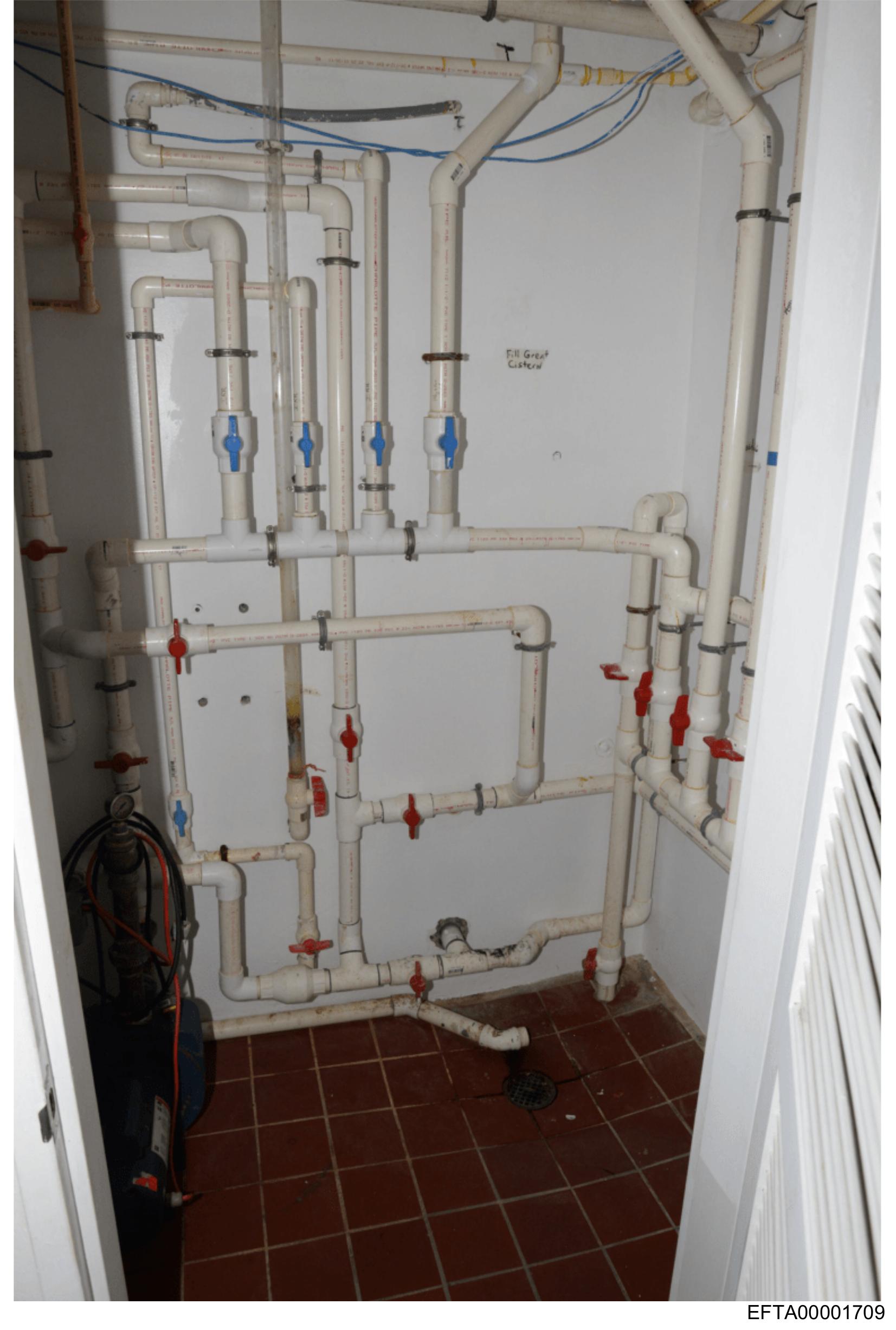 The image shows a room with various pipes and fixtures on the wall, which resemble a plumbing setup typically found in a house.