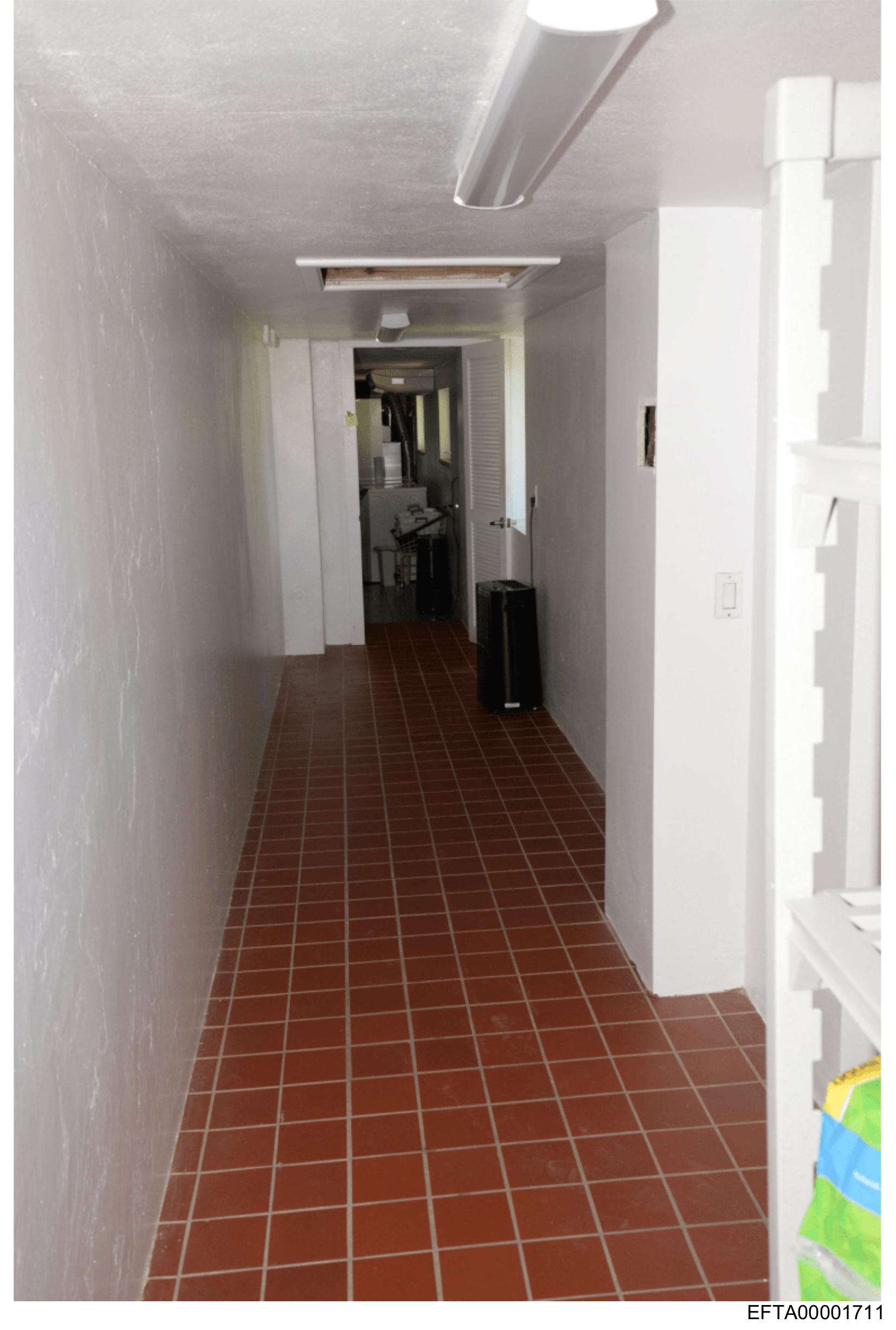 The image shows a narrow hallway with tiled flooring and white walls.