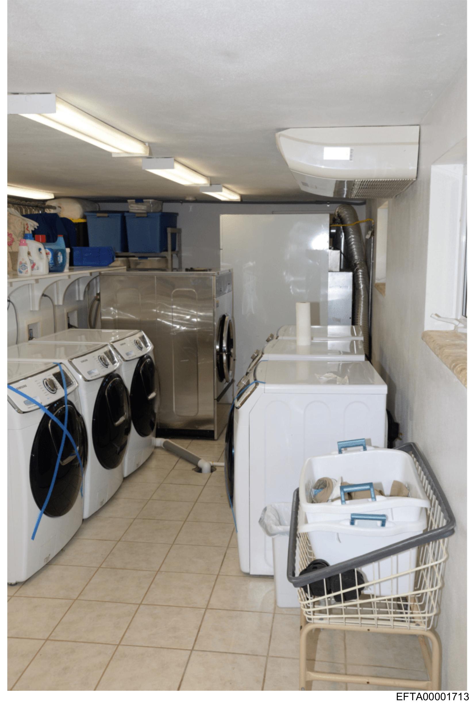 The image shows an interior room with a tiled floor and walls. In the center of the frame, there is a row of stacked washing machines, each covered by a plastic sheet. The topmost machine has a visible control panel. Above this area, there are shelves holding various items, including what appears to be detergent or cleaning supplies in containers. On the right side, there's an appliance that could be a dryer, with a visible door handle. In front of the room is a white tiled counter topped with stacks of what seem to be plastic bags or covers for the machines. The environment suggests this space might be used for laundry services or industrial cleaning equipment storage. There are no texts or people in sight, and no significant brands or logos are identifiable from this angle.