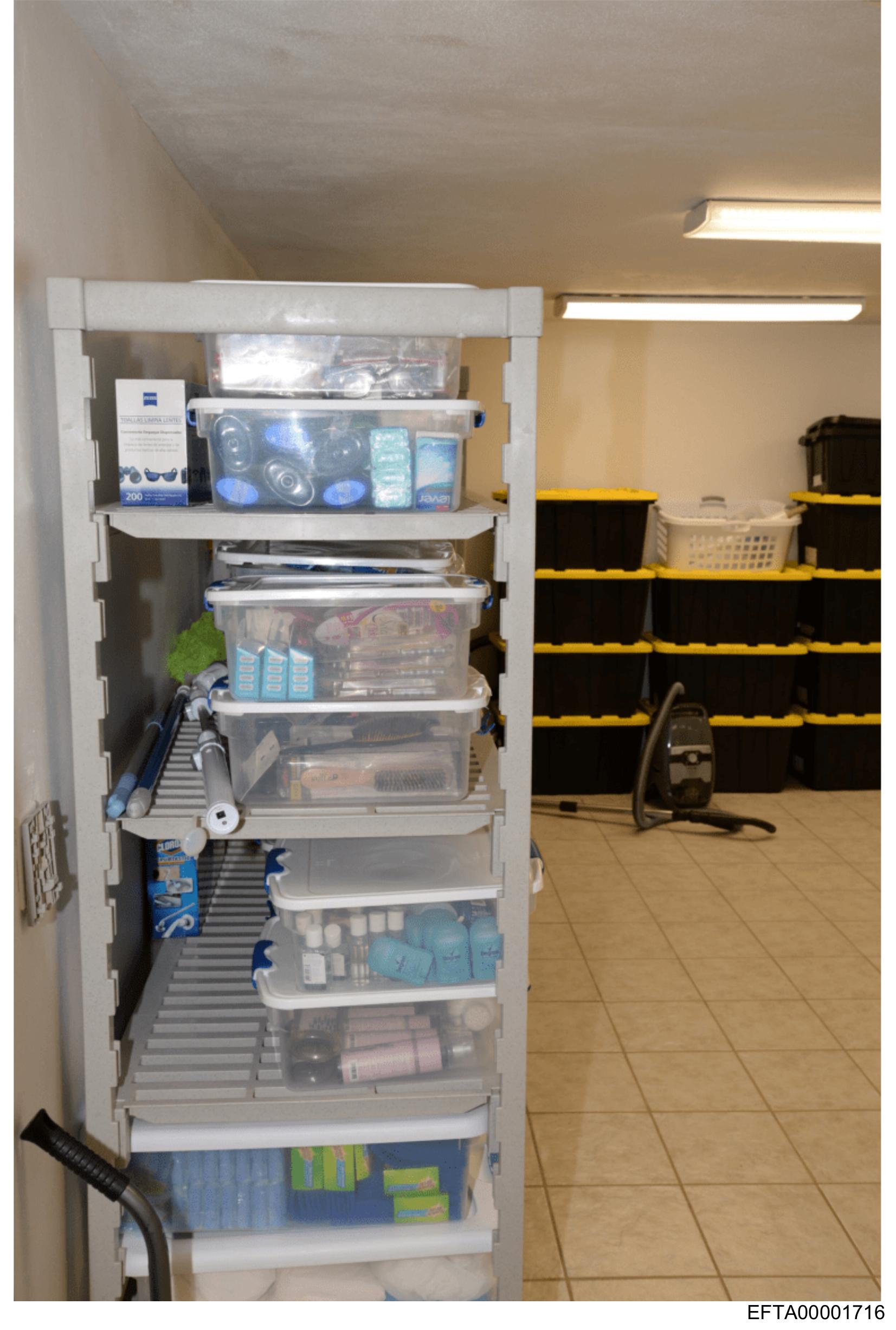 The image shows an indoor setting with a focus on a shelving unit placed against a wall. The shelves are filled with various items including bottles of cleaning supplies, boxes that may contain gloves or other protective gear, and what appears to be a black bin liner bag. There is a visible label on the top shelf that reads "PACKING SUPPLIES" which suggests these items might be used for packing goods or materials. The shelves are made of metal with plastic containers or baskets holding the supplies. In the background, there's another shelving unit and what looks like an industrial-style fan on the floor. There is no text overlaying the image itself, and there are no people visible in this view.