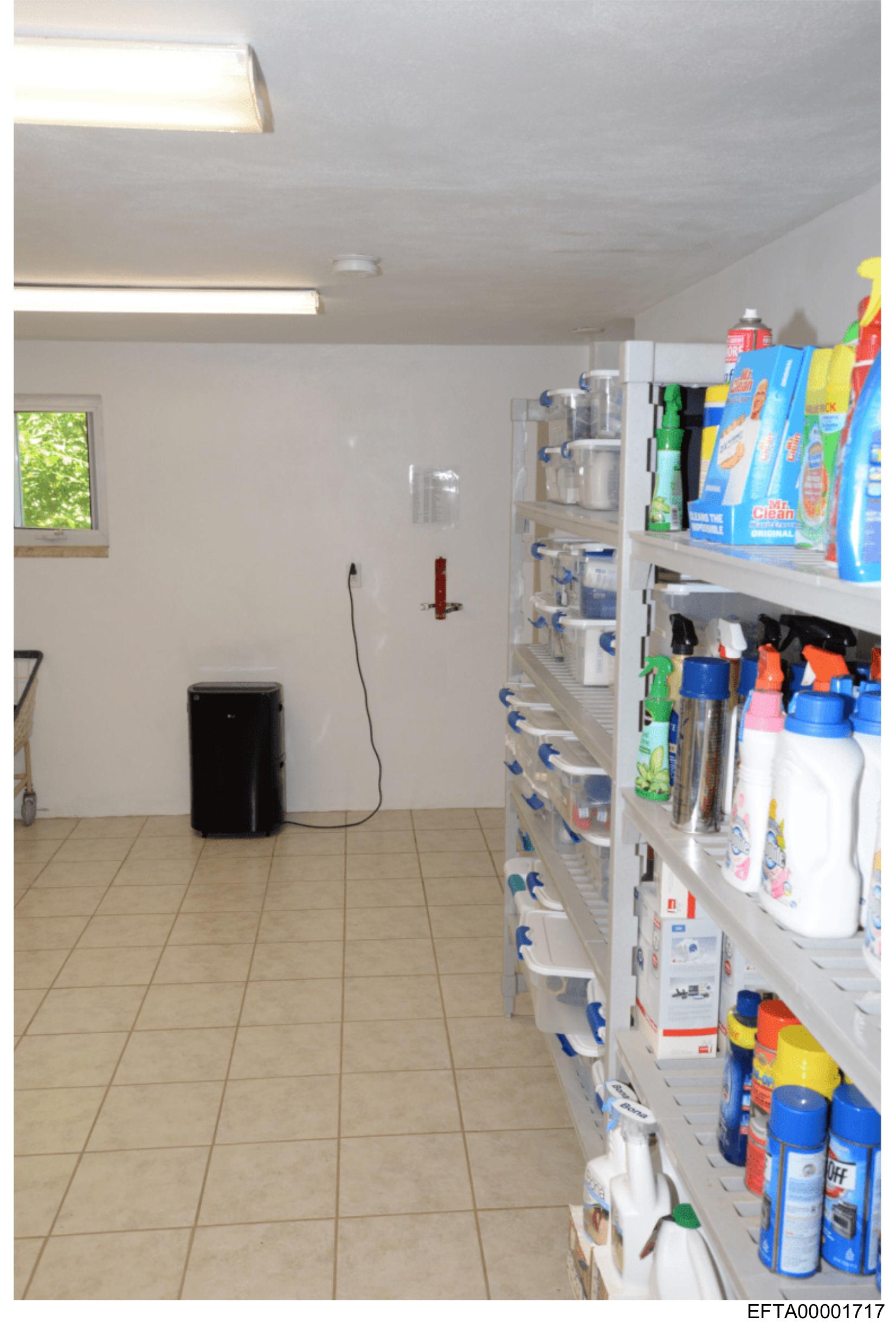 This image shows an indoor room with a white tiled floor and walls that appear to be made of concrete. To the right side of the room, there is a shelving unit stocked with various cleaning supplies. The shelves contain bottles with different shapes, sizes, and colors, likely containing a range of detergents or sanitizers. The lighting in the room is fluorescent, casting soft shadows on the floor. There are no visible texts or distinctive brand markings that would allow for specific identification of the products or location. No people are present in the image.