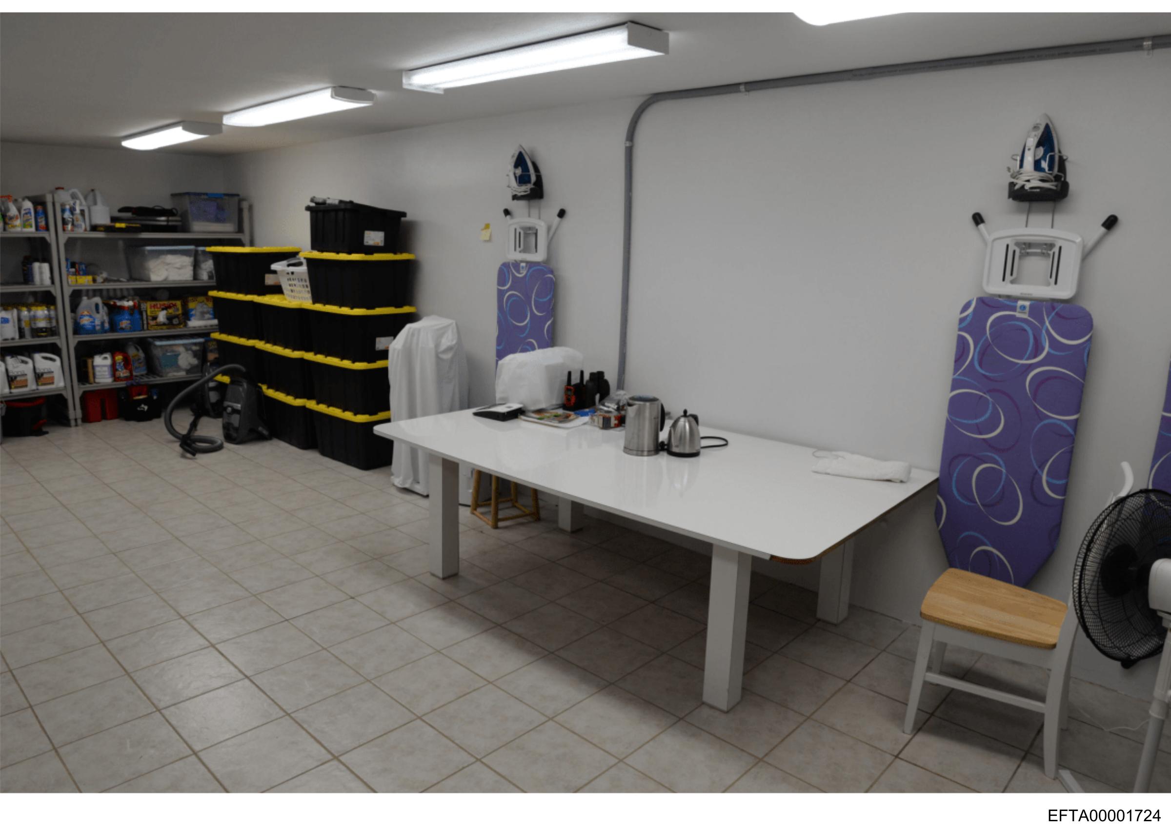 The image depicts a room with a workshop feel. On the left side of the room, there's a white table with various items on it and around it. Behind the table, a large purple surfboard is leaned against the wall. The floor has tiled patterns. In the background, to the right, there are shelves filled with what appear to be boxes or containers. There is a yellow cord hanging from above. At the bottom left corner of the image, there's some text that says "IM_START" and at the top right corner, the word "EXIF" followed by a number (although it is partially obscured) can be seen. No people are visible in the image. The style of the photo appears to be casual, perhaps taken with a smartphone due to the presence of EXIF data typically associated with such devices.