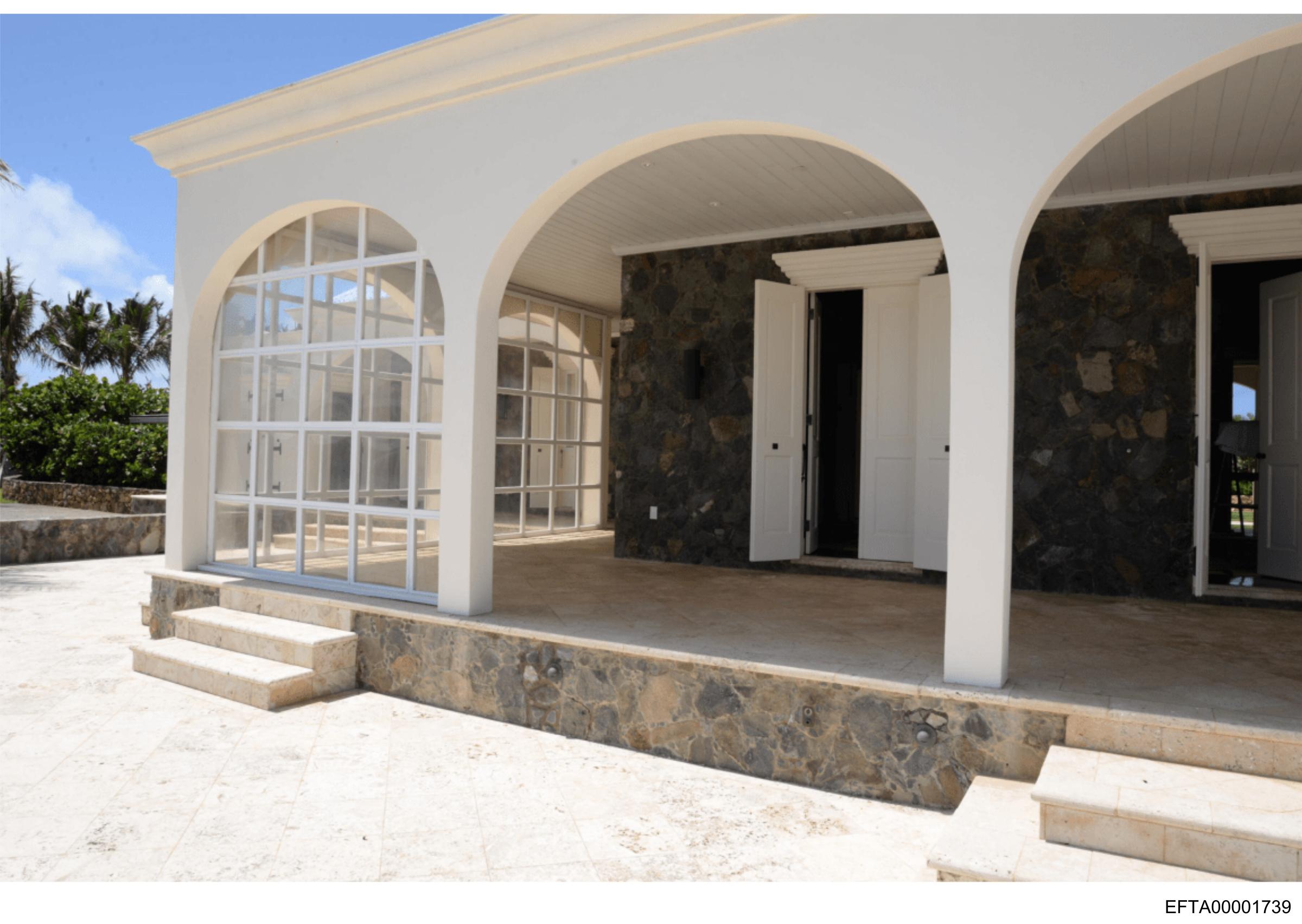 The image shows a two-story house with an outdoor area that has a stone floor and white columns. There are large windows on the lower level of the house through which sunlight is streaming in, illuminating the interior. The architecture suggests a Mediterranean or coastal style, with arched openings and stucco walls. There's no visible text, people, or significant objects that stand out within this description. The sky is clear, indicating a sunny day.