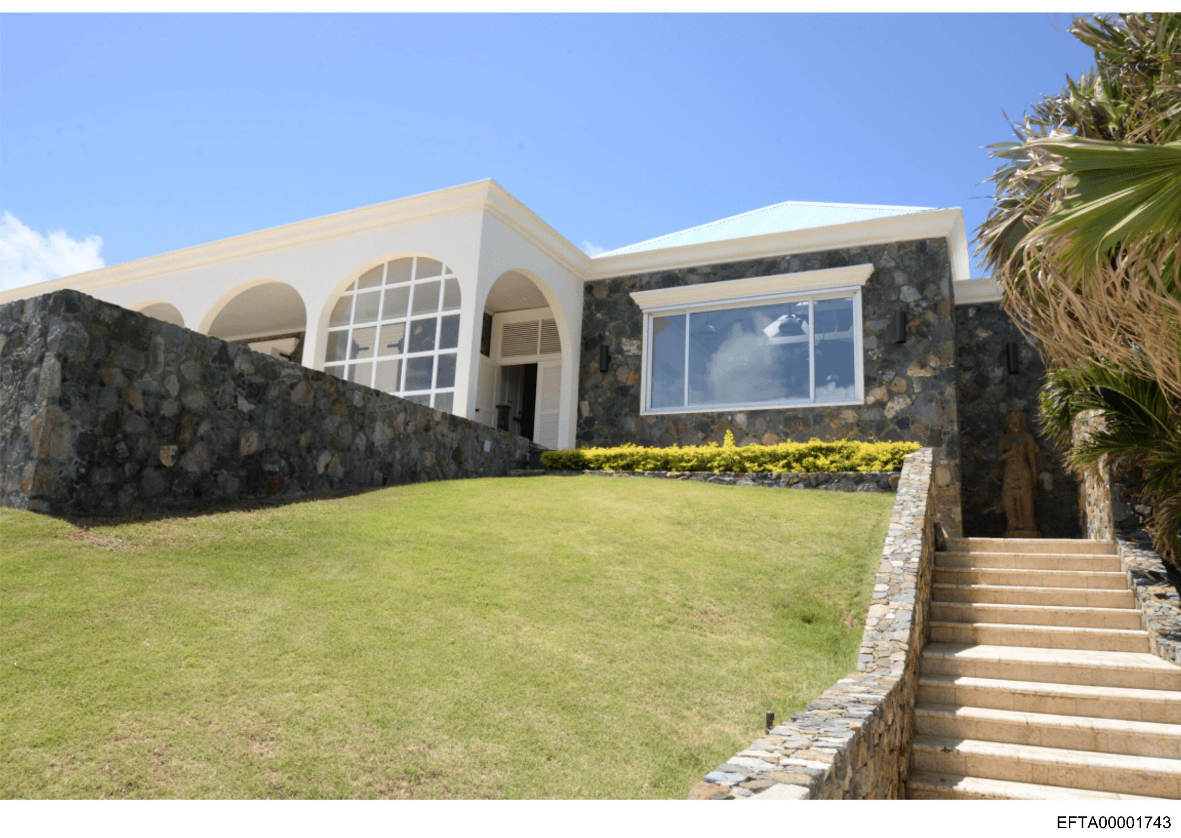 The image shows a modern house with architectural features such as large windows and what appears to be a flat roof. The house is surrounded by lush greenery and is situated on an elevated area with steps leading up to the entrance. There are no visible texts or people in the picture, and the style of the photograph seems professional, possibly intended for real estate or promotional use. The sky is clear blue, indicating good weather conditions at the time the photo was taken.