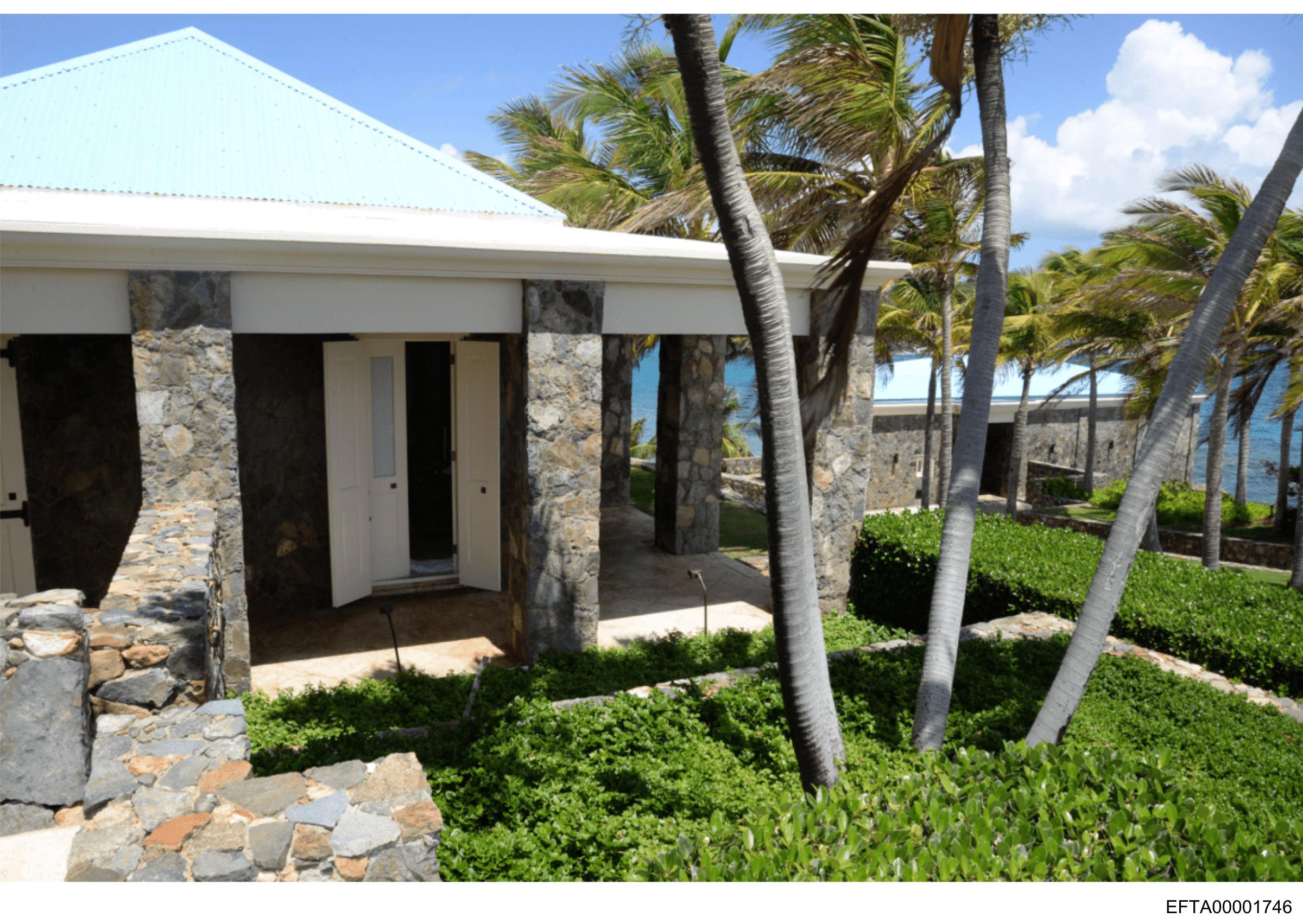 The image depicts a tranquil outdoor scene with a focus on a building that resembles a traditional cottage with a pitched roof and stone walls. In the foreground, there is lush greenery consisting of palm trees with fronds extending from their trunks, creating a tropical ambiance. The sky above is clear with few clouds, suggesting it might be midday or late afternoon. To the left side of the frame, part of an entrance to the building can be seen; there's a white door partially visible and what appears to be a small porch area with a railing. The architecture suggests a location that may be in a warm climate region, possibly a vacation spot or resort given the well-maintained landscaping and peaceful setting. There is no text present in the image, nor are any people identifiable within the frame.