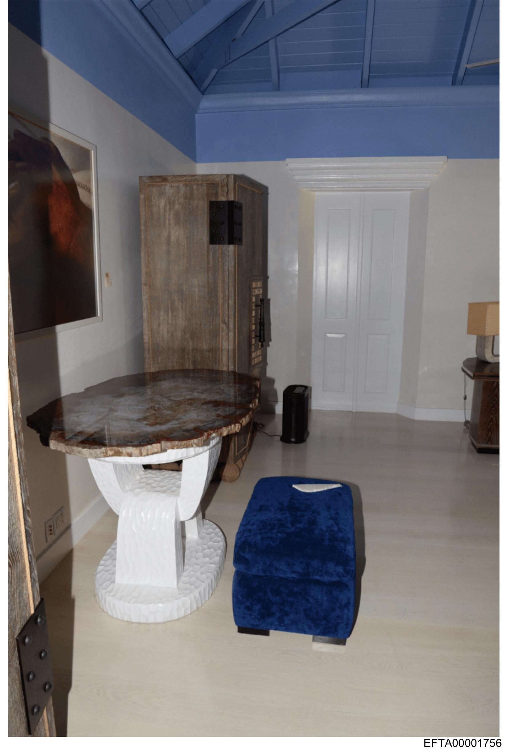 The image shows an interior space with a modern design. At the center of the frame is a round marble table surrounded by a plush blue ottoman, suggesting a cozy seating area. To the left of the table, there's a tall wooden cabinet that adds a touch of traditional style to the room. On the wall behind these pieces of furniture, there's a framed artwork hanging at eye level. The ceiling features exposed beams painted in a lighter color, which contrast with the darker tones of the walls and cabinet. There are no texts or people visible in the image.