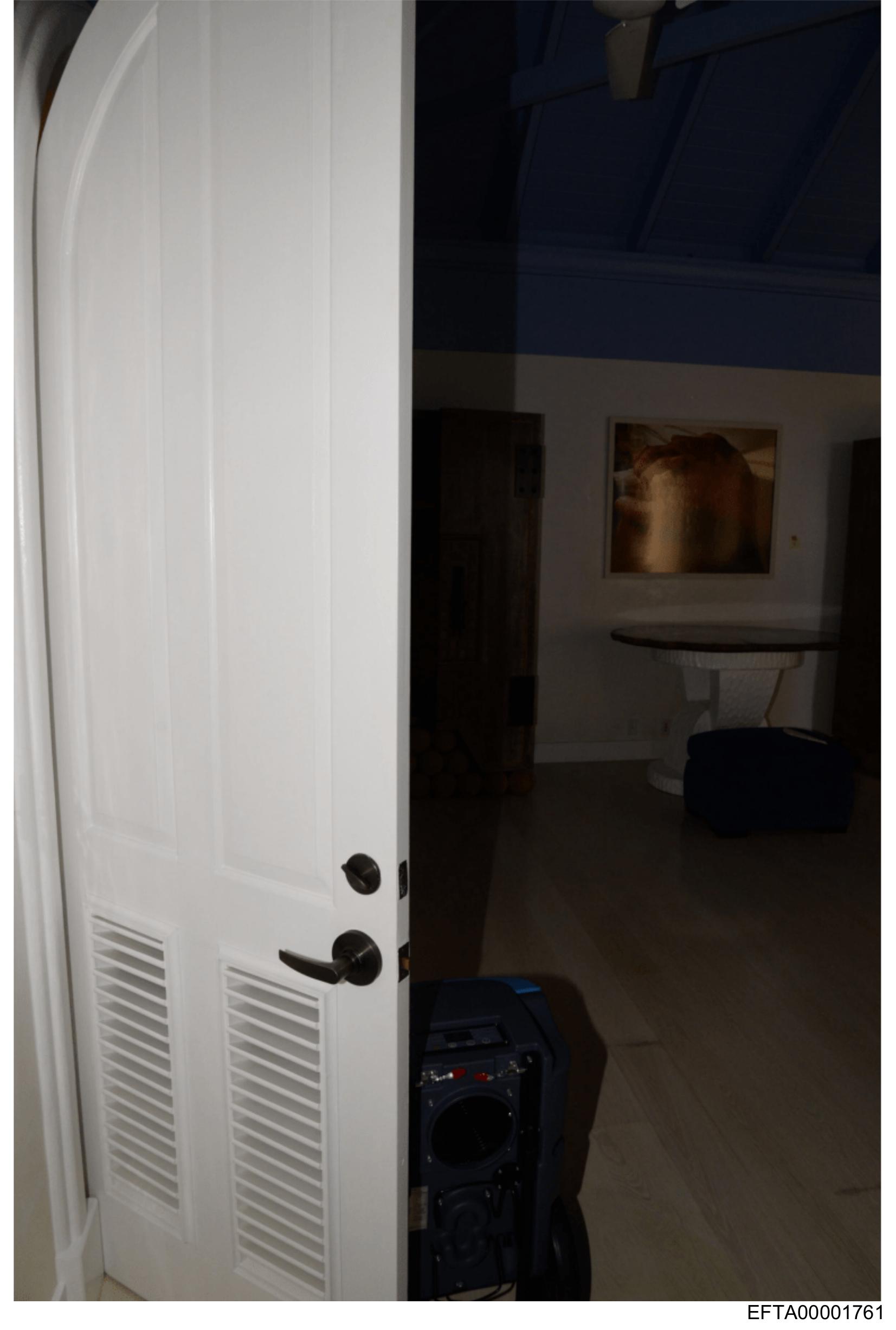 The image shows an interior doorway with a view into a room with hardwood flooring and various pieces of furniture and decor.