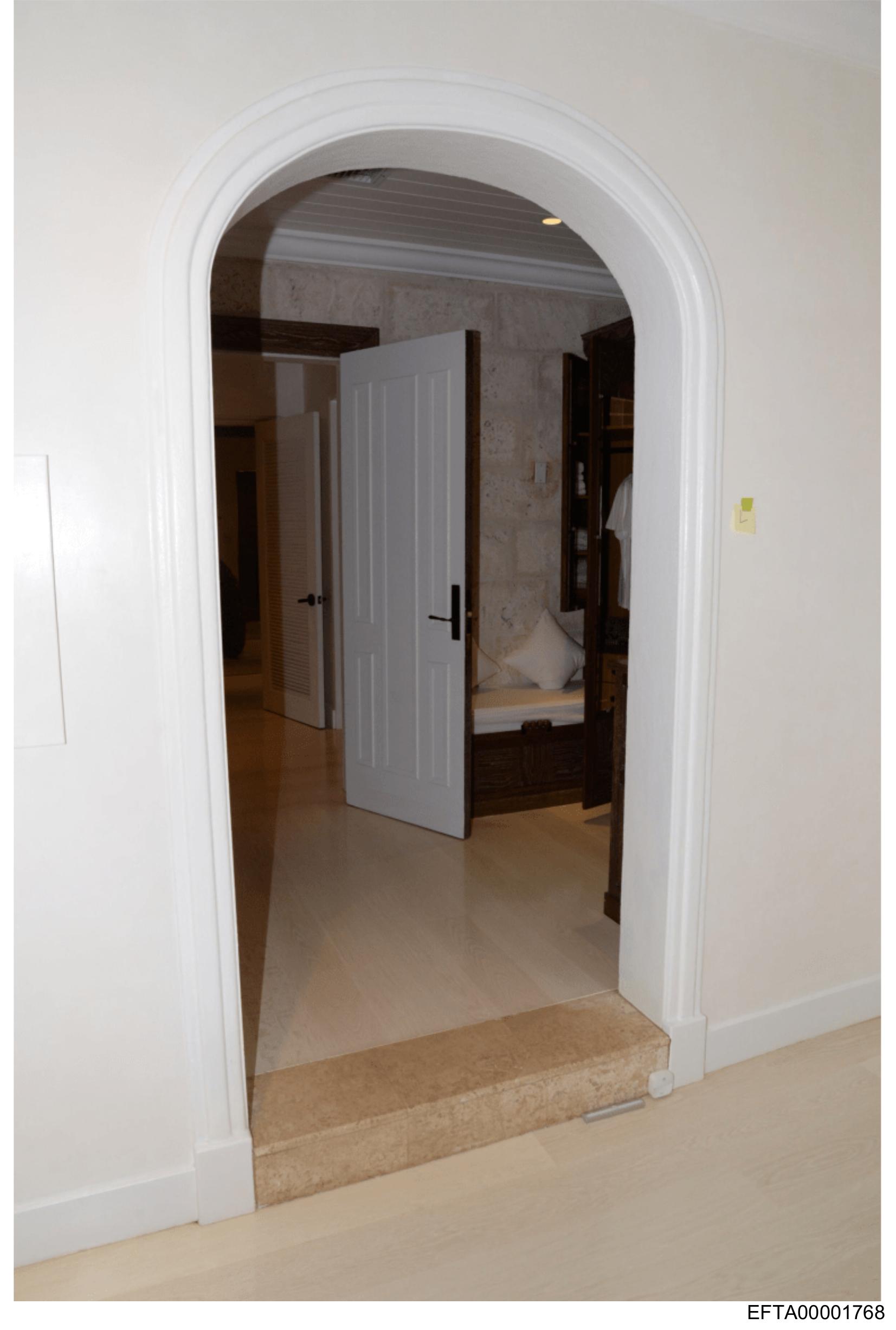 The image shows an interior view of a doorway leading into another room within a house. To the left, there is a partial view of a wall with a white archway above the door frame. The floor is a light-colored wood or laminate, and there's a small step down as one enters the other room, suggesting that the flooring materials are different on either side of the threshold. In the background, we can see what appears to be a bookshelf with various items stored on it, indicating this might be a living space like a study or a bedroom. The overall lighting is soft and ambient, creating a calm atmosphere. There is no visible text in the image.