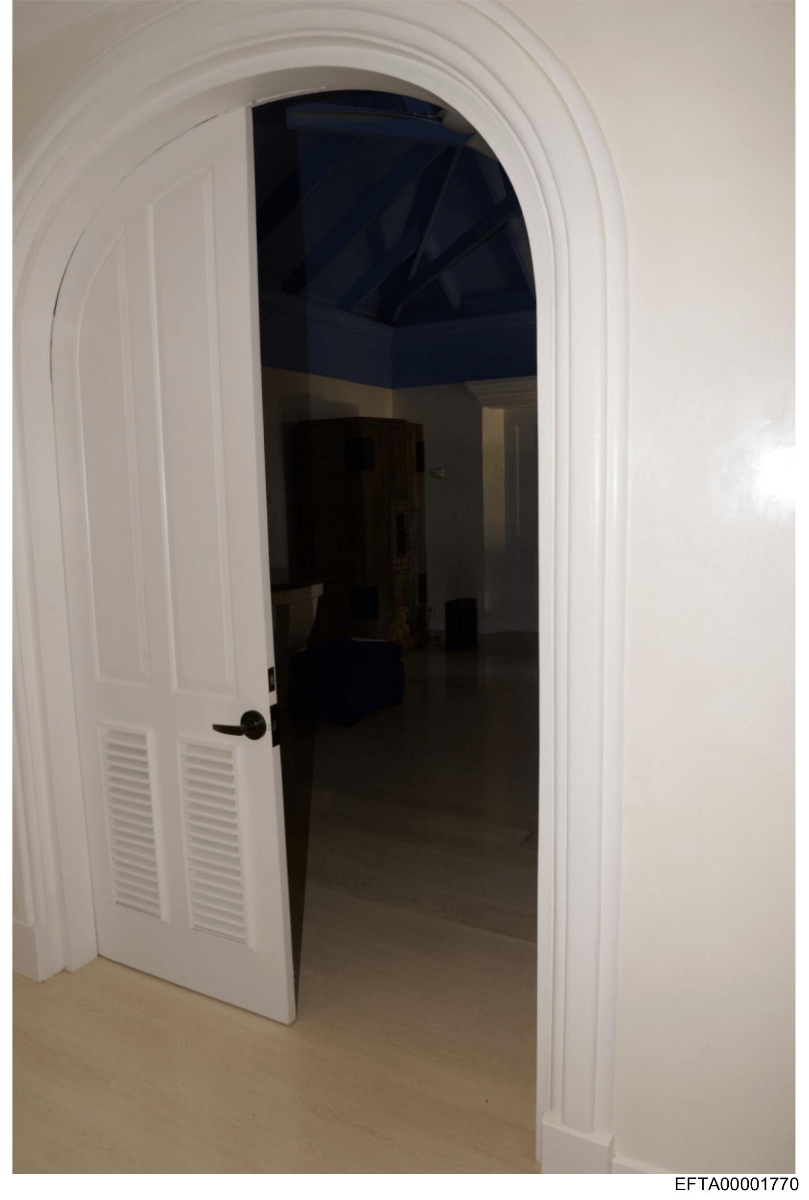 The image shows an interior view through a doorway into a room with a high ceiling that features exposed wooden beams painted in blue.