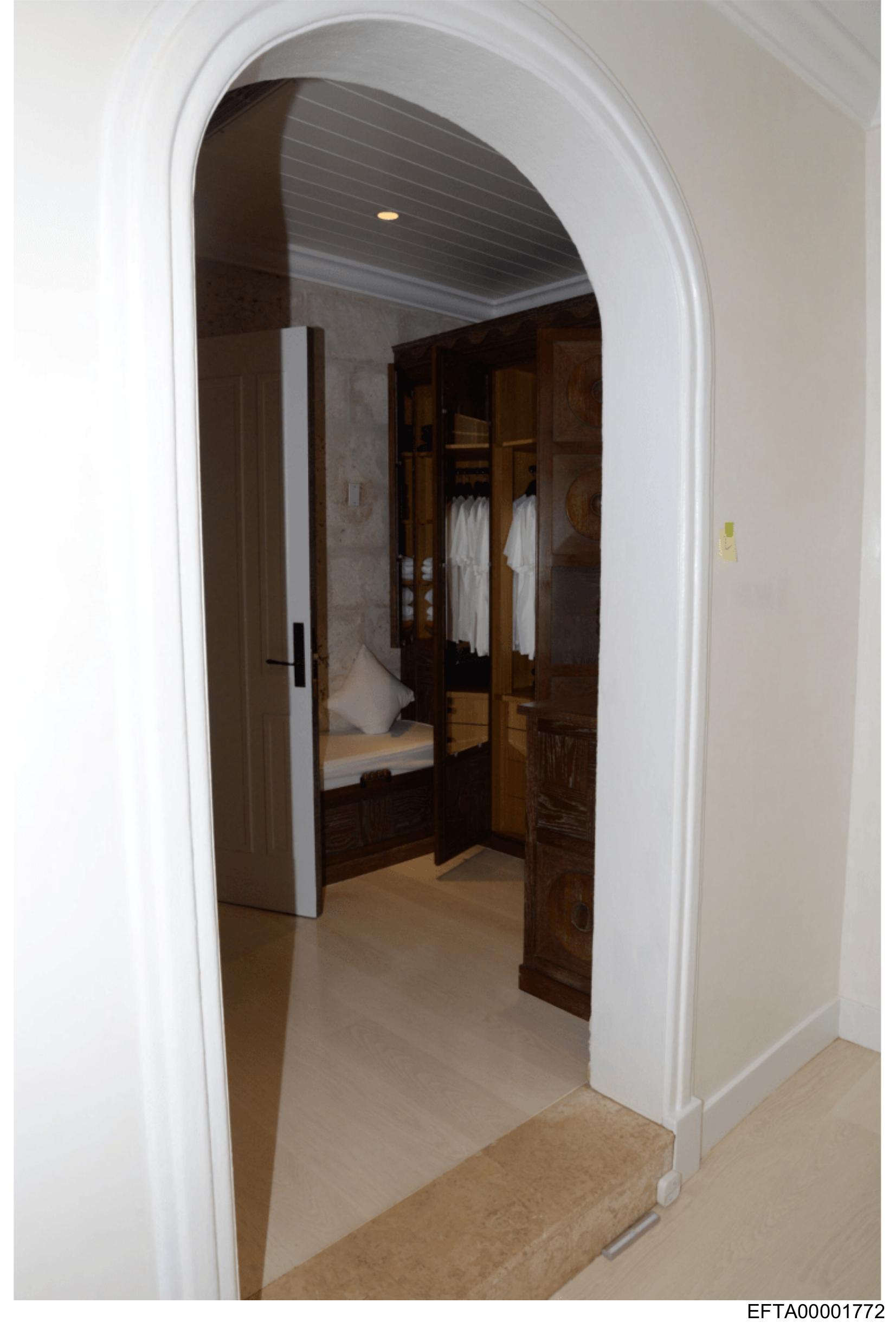 The image depicts an interior view of a room with light fixtures. There is a distinct archway to the right that frames another room featuring what appears to be a walk-in wardrobe with hangers on clothing and shelves for storage. The floor is covered by a soft-looking rug, suggesting comfort in the space. No text or people are visible in this image. The style of the photograph is candid, possibly taken during a home tour or exploration, as it captures an authentic glimpse into someone's living space.