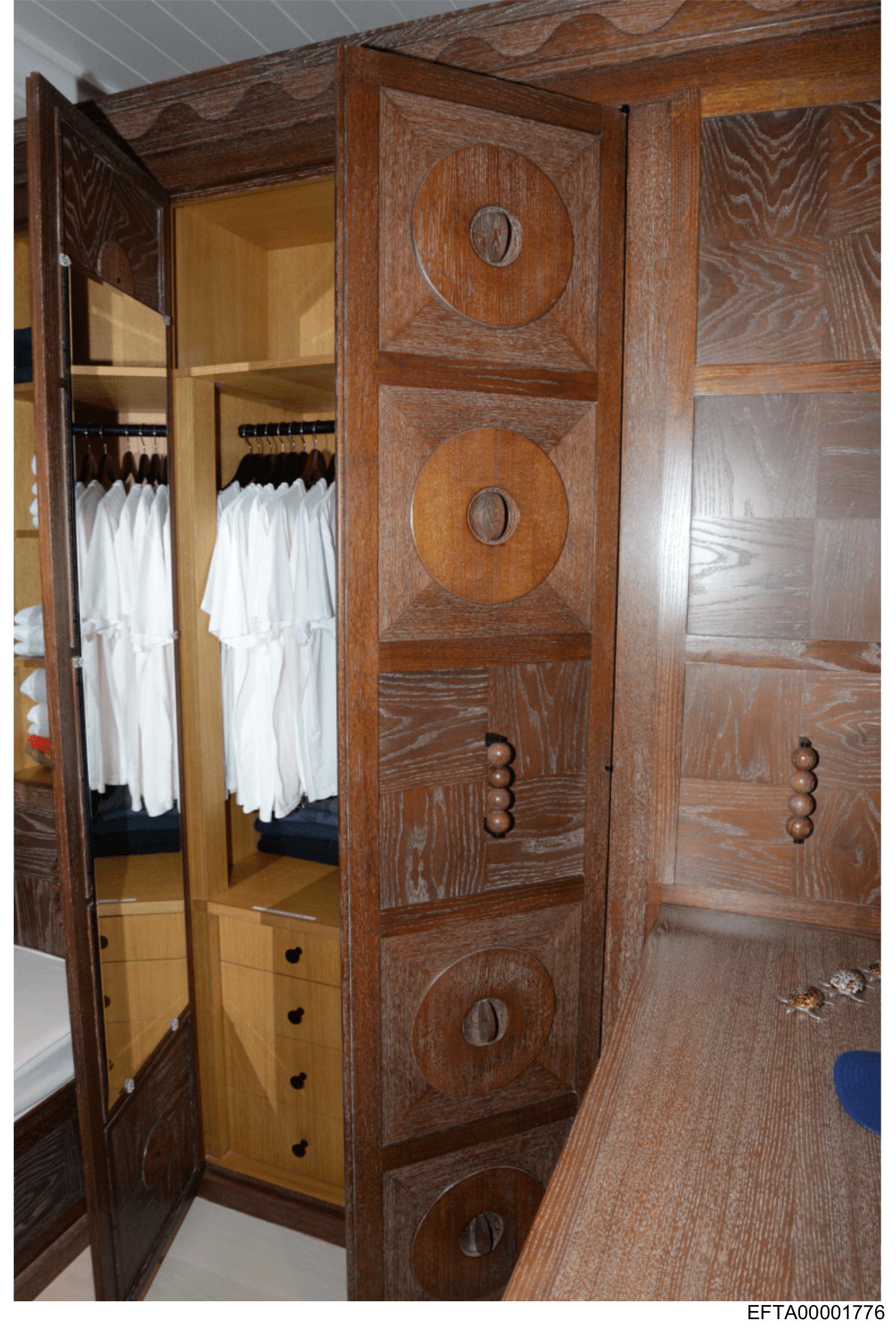 The image shows an open wardrobe with a wooden finish and a classic design.