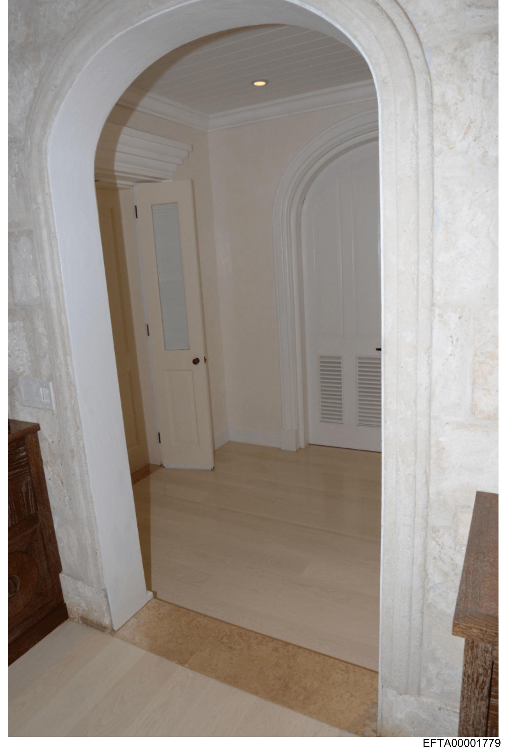 The image shows an interior space viewed through a doorway archway with a white frame and stone cladding above the door.