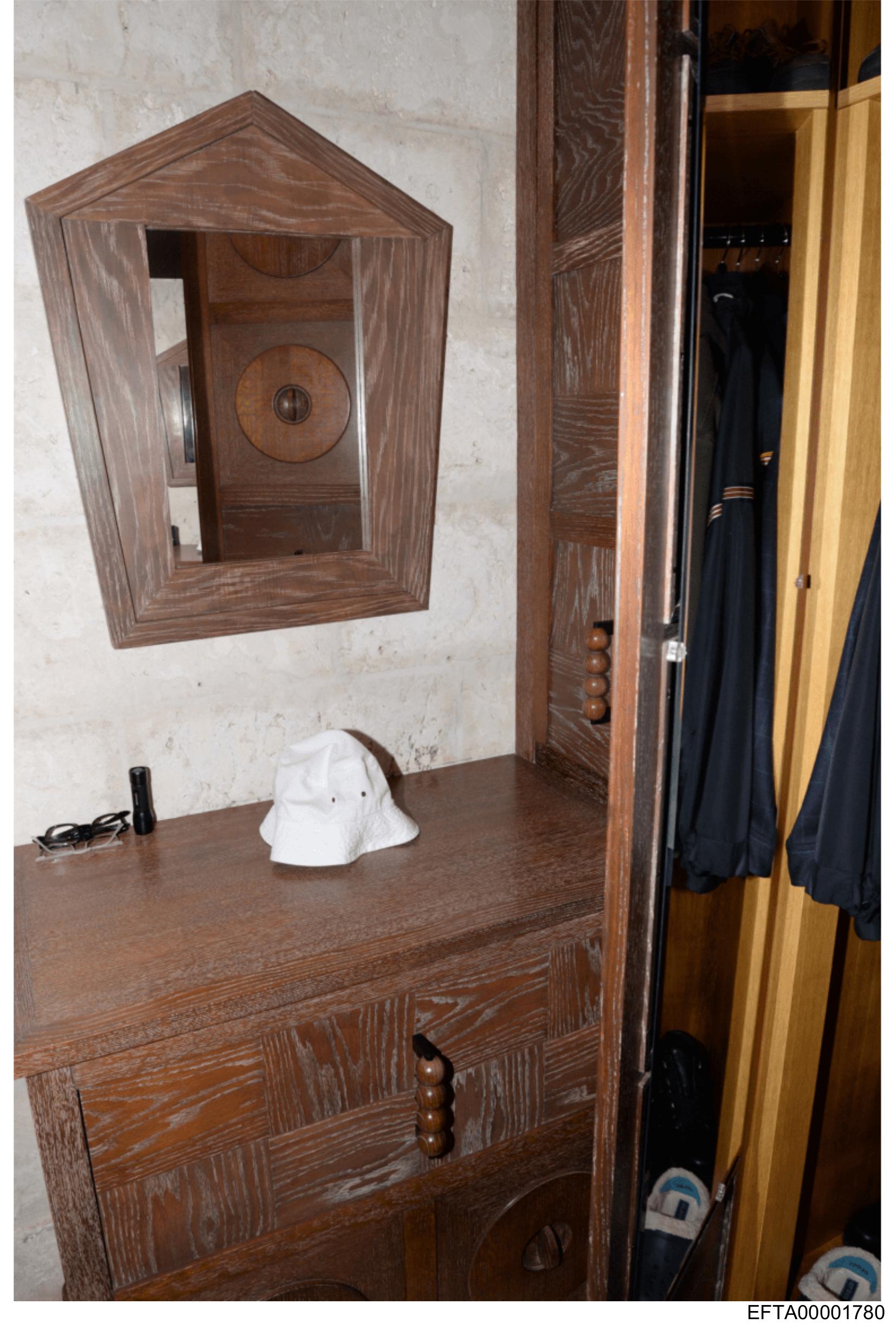 The image depicts an interior scene of a room with a rustic feel. On the left side of the frame, there is a wooden desk with a rectangular mirror hanging above it on the wall. The desk has some items on top, including what appears to be a pair of glasses and a small white object that could be a hat or bag. To the right, the image shows an open wardrobe revealing hangers and clothes inside. There are no visible texts, people, or recognizable locations in the image. The overall style suggests it might be taken from a personal space, possibly a bedroom or dressing area within someone's home.