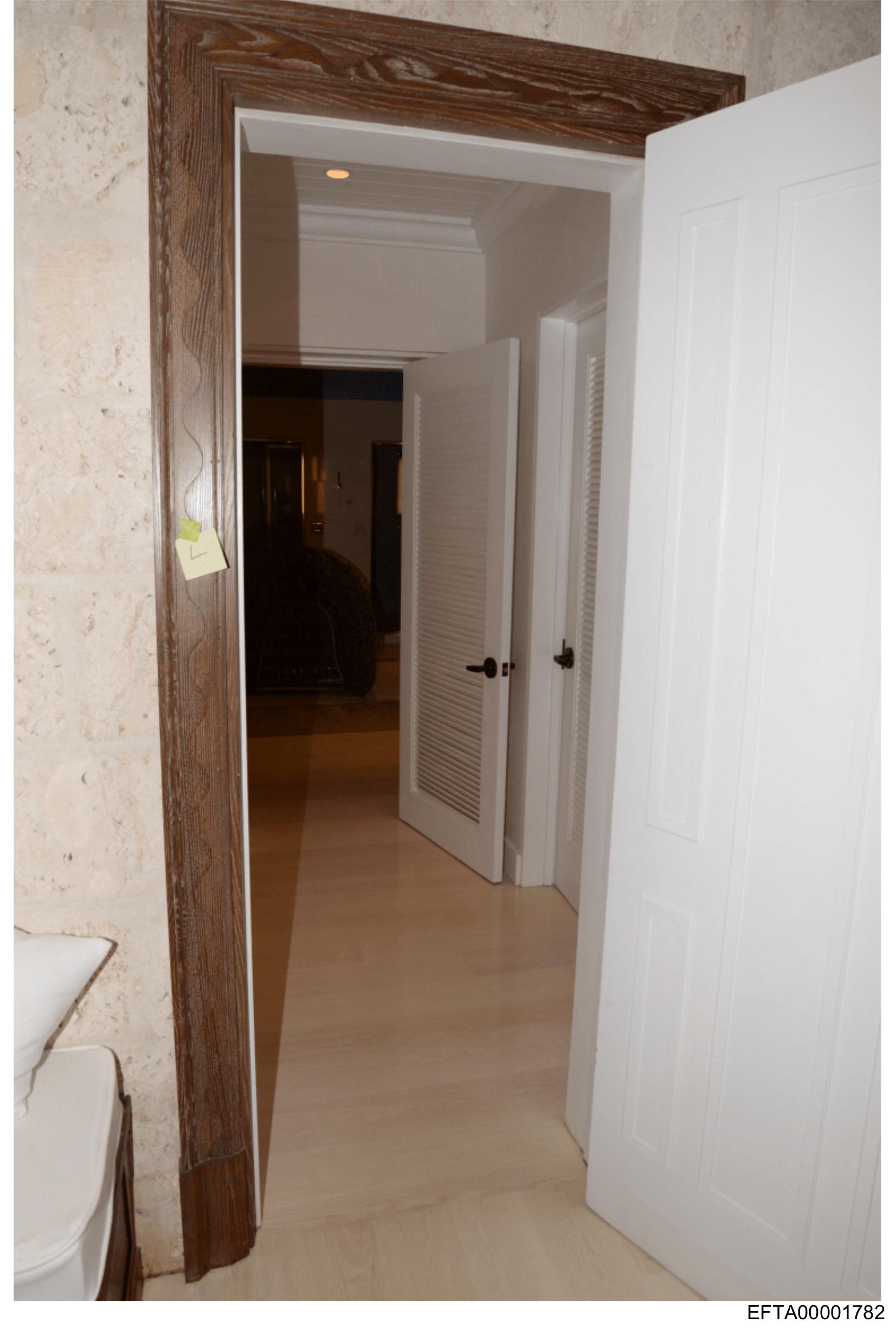 The image shows an interior view of a hallway with closed white doors on either side, suggesting an entrance area within a building.