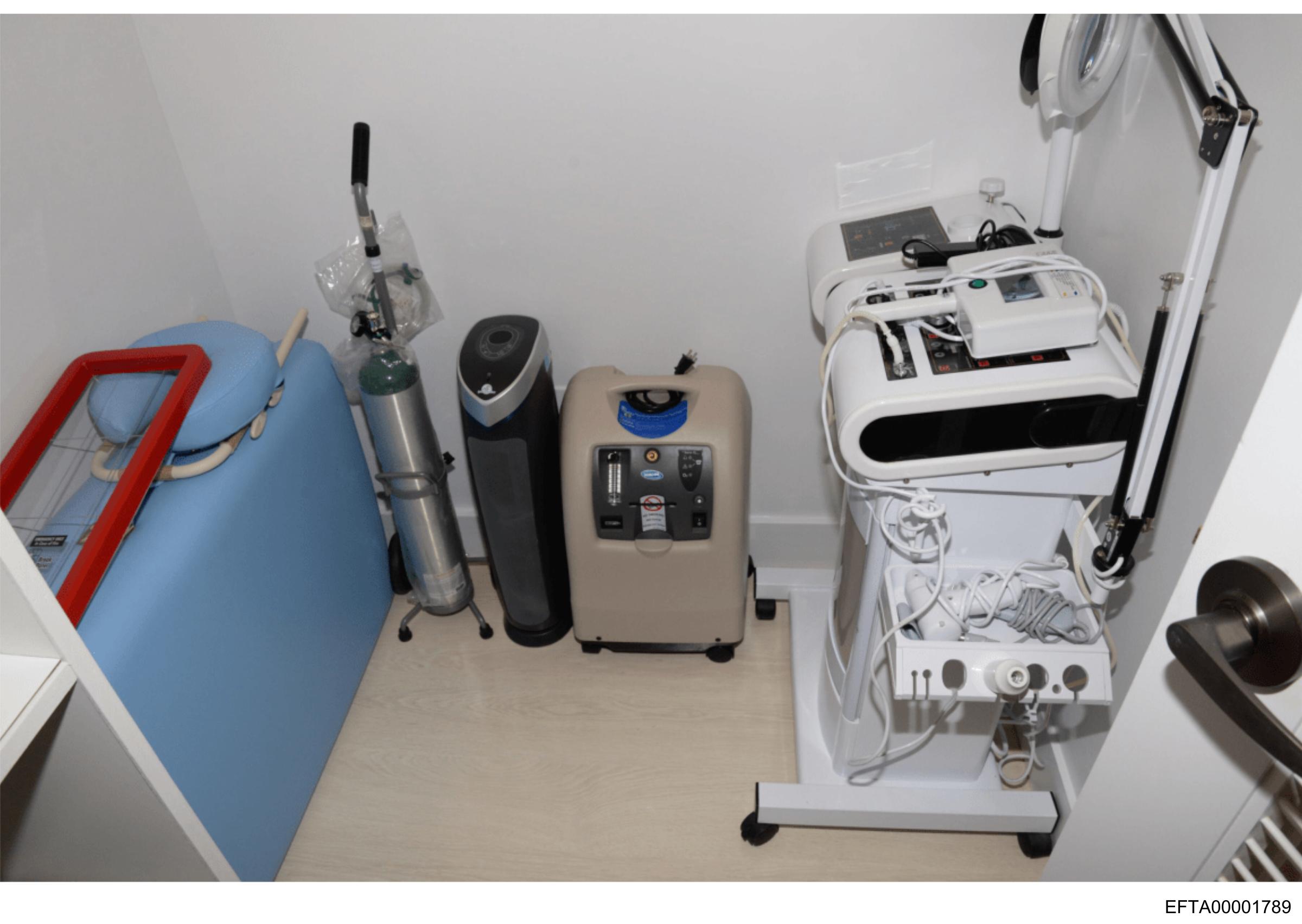 The image shows an indoor space that appears to be a room used for some kind of medical or scientific equipment. There is a large piece of machinery with various tubes and attachments on its side, suggesting it might be a piece of laboratory or diagnostic apparatus. To the right, there's a portable oxygen tank. The color scheme of the room is subdued with white walls and lighter-colored flooring. There are no visible texts, people, or recognizable locations that provide additional context about the setting. The image has a watermark in the lower right corner with some text, but it's too small to read clearly.