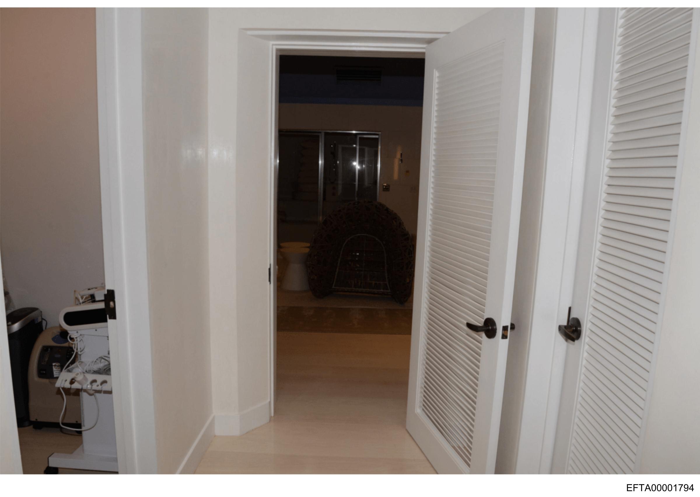 The image shows an interior hallway with a door on the left and another one on the right.