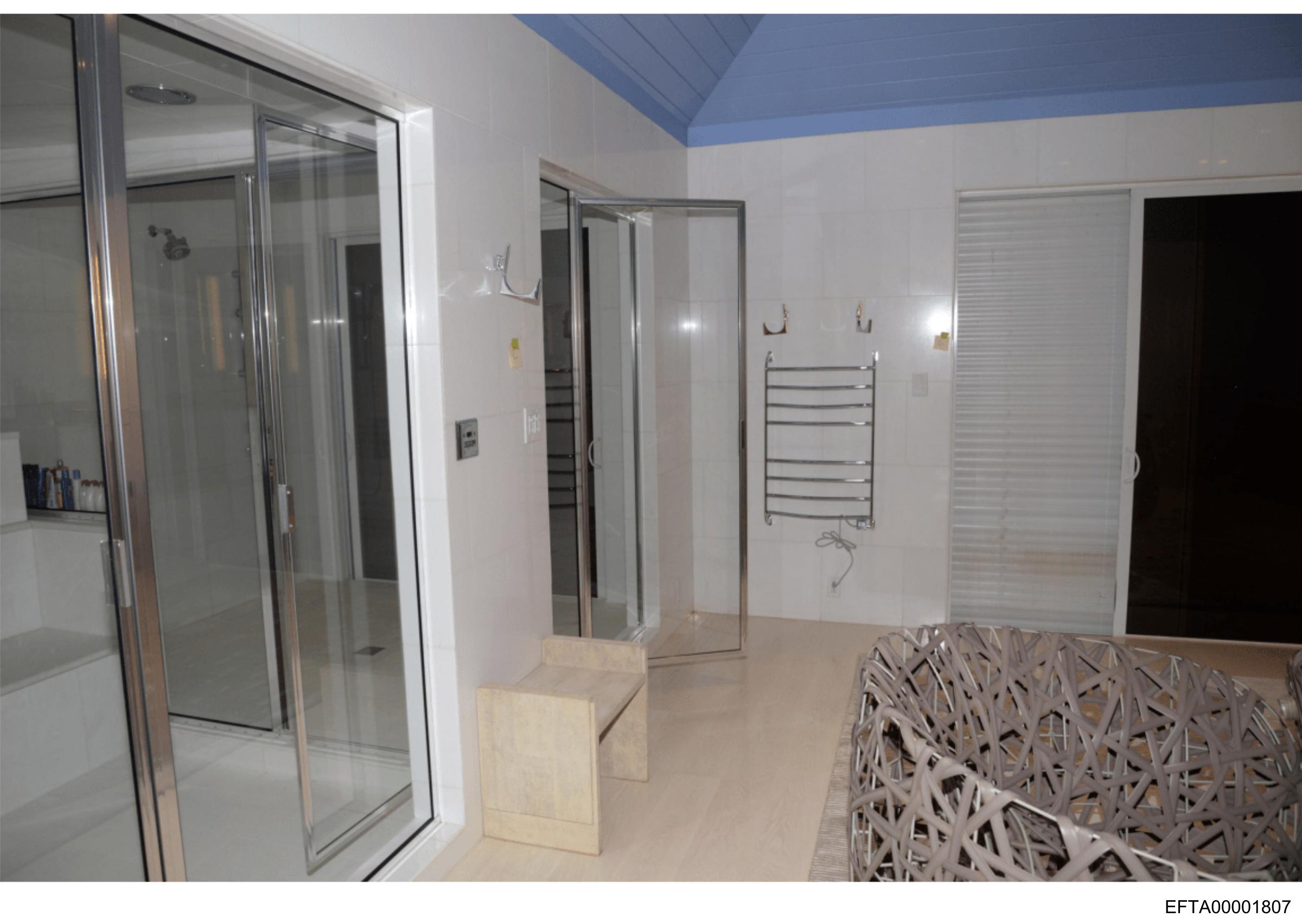 This is a photograph depicting an interior space with design features that suggest it's a bathroom. The image includes a large, floor-to-ceiling glass shower enclosure with silver fittings and a white, rectangular bench inside. Adjacent to the shower area, there is a wall-mounted towel rack holding folded towels. The ceiling has recessed lighting and appears to be painted in two tones of blue, creating an aesthetic contrast with the neutral colors of the walls and floors. There are no visible texts, people, or significant objects that stand out from the typical bathroom setting. The image captures the space in a straightforward manner without any distracting elements or artistic filters applied.