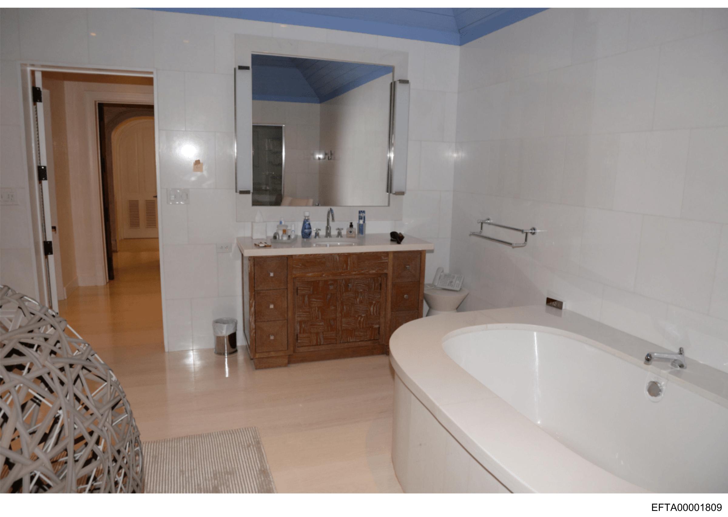 The image shows an interior bathroom scene. Dominating the foreground is a white bathtub with its feet elevated off the ground by small pillars. To the right of the tub, there's a sink area with marble countertops and a wooden cabinet underneath. Above the sink hangs a rectangular mirror, reflecting parts of the room. In the background, a portion of an open door is visible, suggesting access to another space. The floor appears to be tiled in a light color, complementing the overall neutral palette of the bathroom. There are no texts or people present in the image.