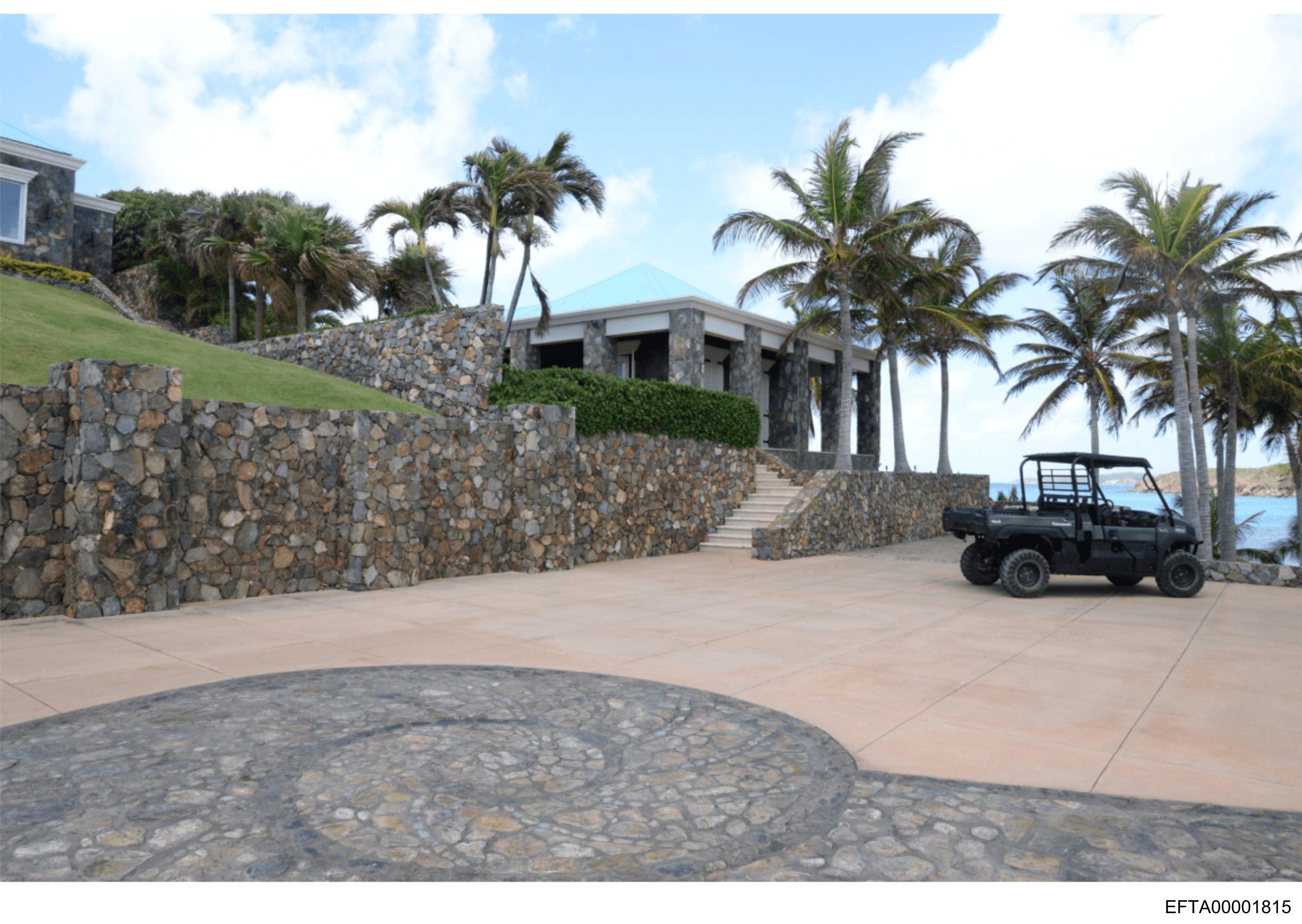 The image shows a tropical outdoor setting with lush greenery and palm trees lining the background. A large vehicle, resembling an ATV (All-Terrain Vehicle), is parked in front of what appears to be a stone structure or house with multiple levels visible above the topmost trees. The sky is clear and blue, suggesting it might be a sunny day. In the foreground, there's a paved area that seems to be part of a patio or outdoor walkway. There are no texts visible in the image, and any people present would be too small to discern due to the perspective and angle of the photo. The style of the photograph is realistic with natural colors.