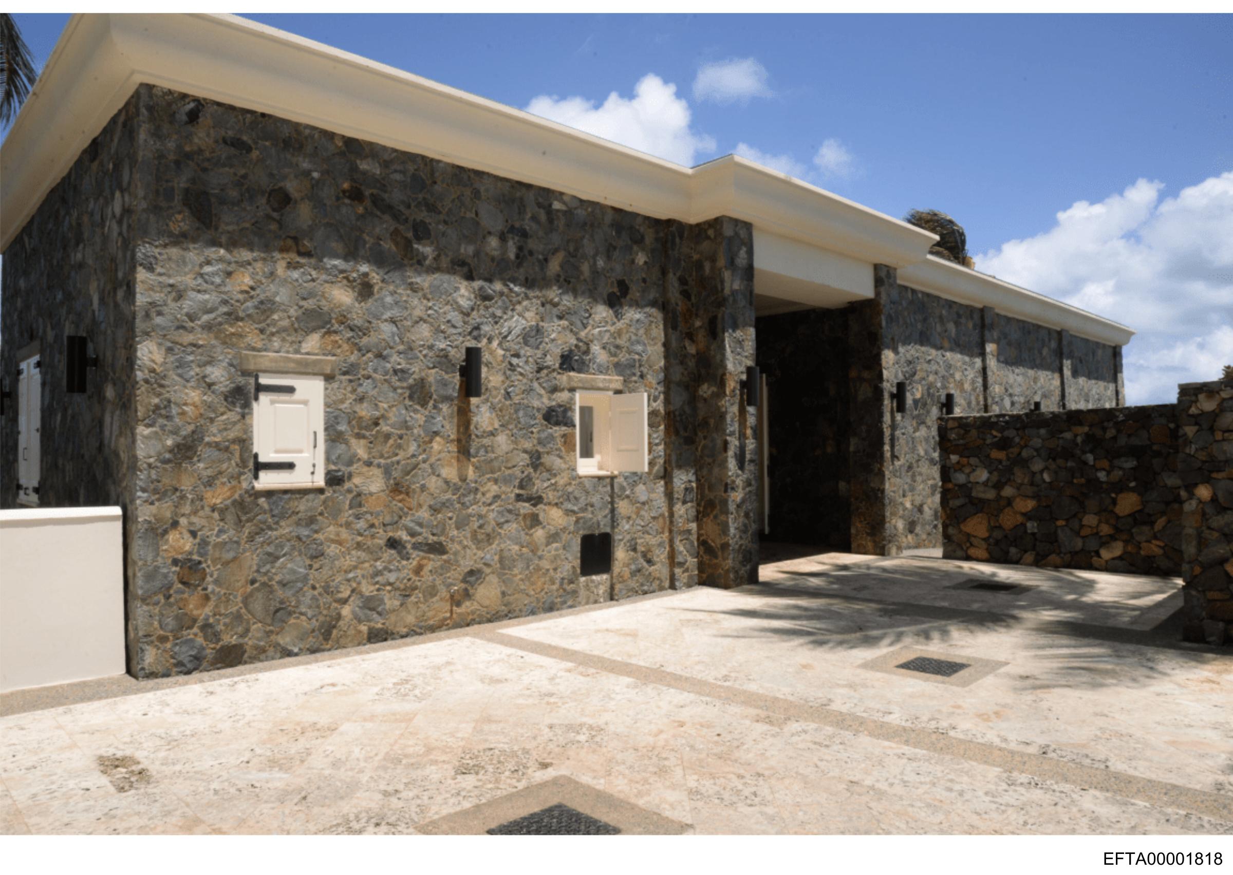 The image shows the exterior of a house with stone walls and a flat roof. There are no visible texts or distinctive brands on the building. The house appears to be part of a residential area under a clear sky. The architecture suggests a simple, possibly rural style, and there is a small structure that could be an extension or outbuilding next to it. There are no people present in the image.