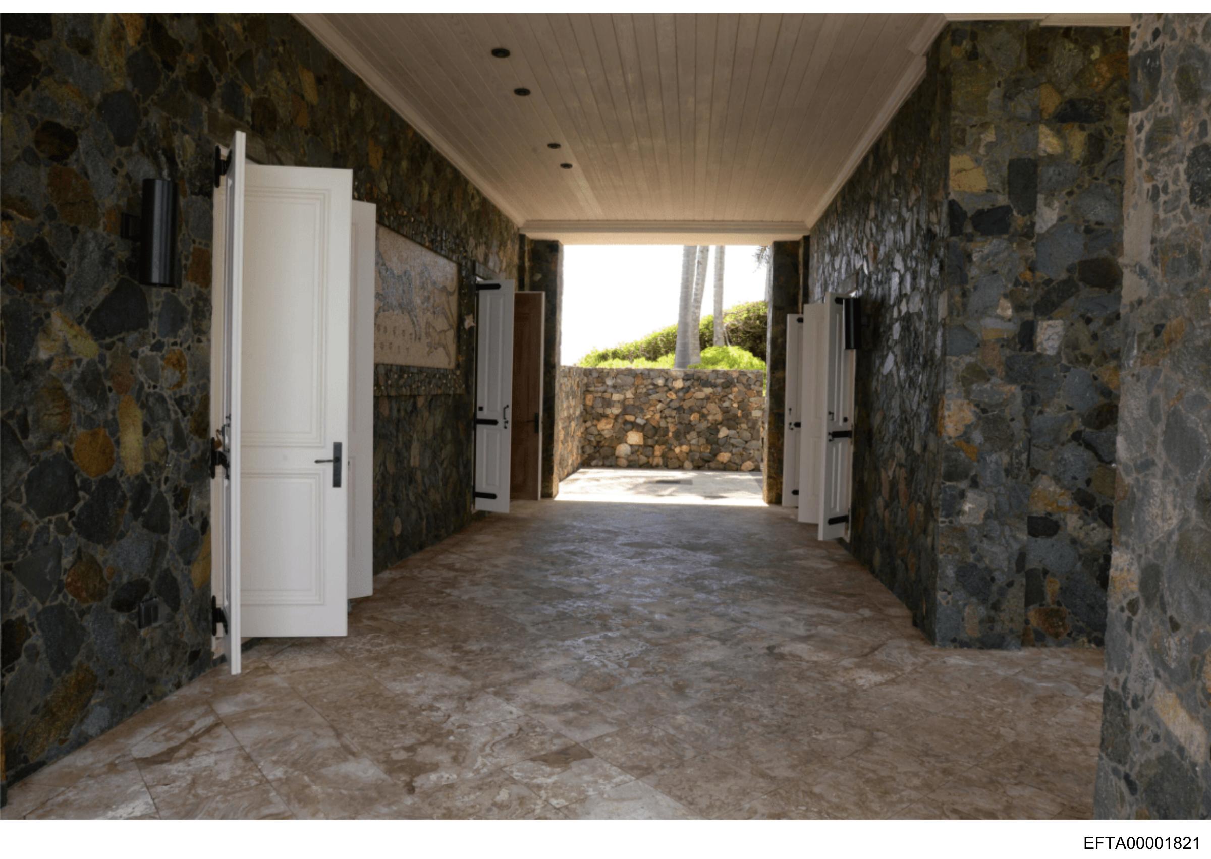 The image shows the interior of a spacious building with natural light coming through its windows and doorways. The walls are finished with dark-colored stone tiles that give a rustic yet modern appearance to the space. A white door is open on the left side, leading out to an unseen area beyond. In the center background, there's another doorway partially visible behind a partition wall with similar stone cladding. The floor appears to be of light color, possibly marble or concrete, complementing the darker walls. There are no people visible in this section of the image, and the text "ET AX" is present at the bottom right corner, which might be part of an inscription, brand name, or other form of identification that requires further context to understand fully.