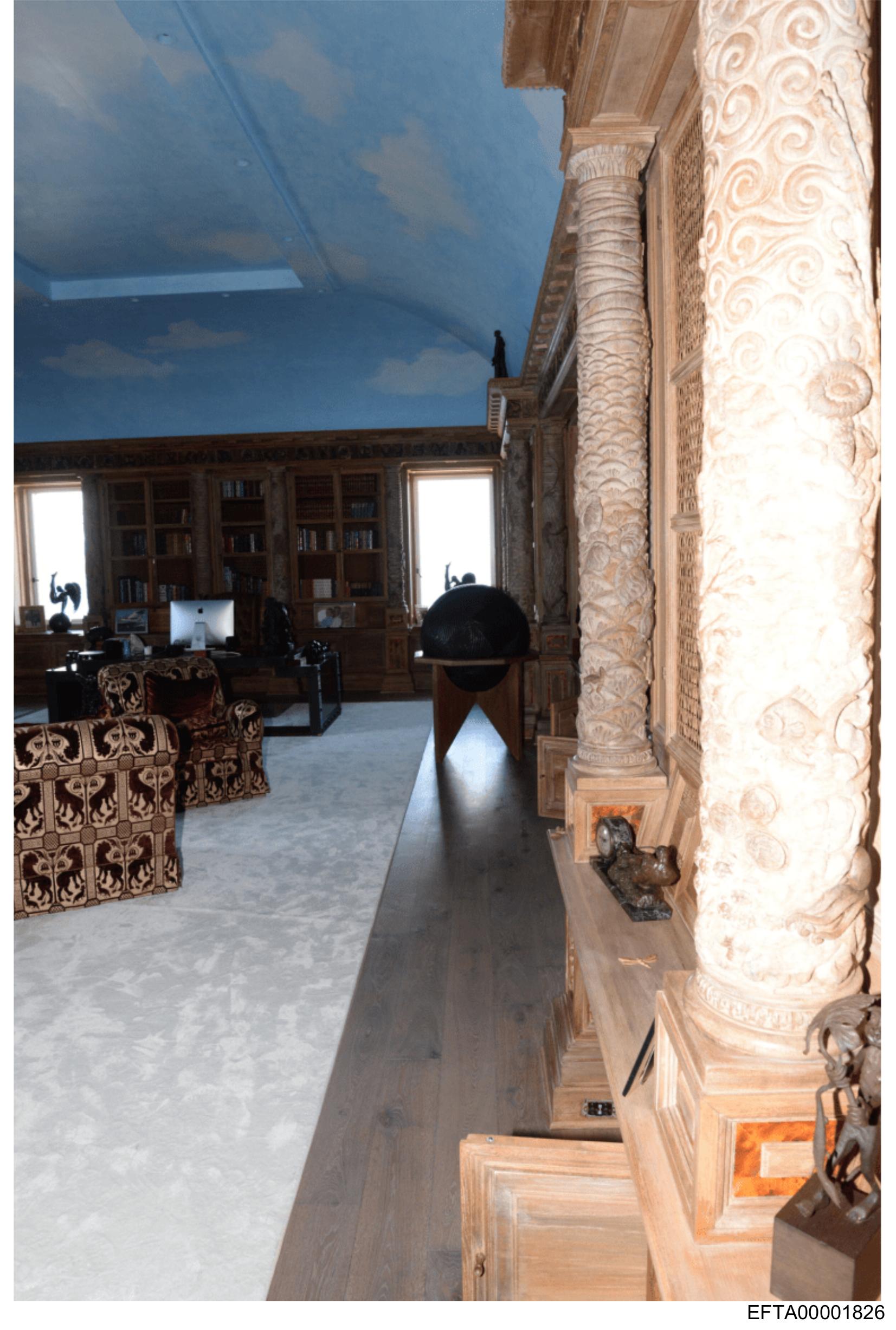The image shows an interior room with architectural details such as decorative columns and a painted ceiling that includes clouds and possibly birds or other flying creatures. There is no visible text in the image. A large wooden cabinet filled with books is prominent on one wall, suggesting a space used for reading or study. The floor appears to be carpeted in a neutral color, which complements the room's muted tones. On the right side of the frame, there is a blurred object that could be part of another piece of furniture or decor; however, it is not clear enough to describe accurately. The style of the image seems candid and may have been taken casually without professional photography equipment, as indicated by the slight blurriness and composition that doesn't follow traditional rules for taking photographs.