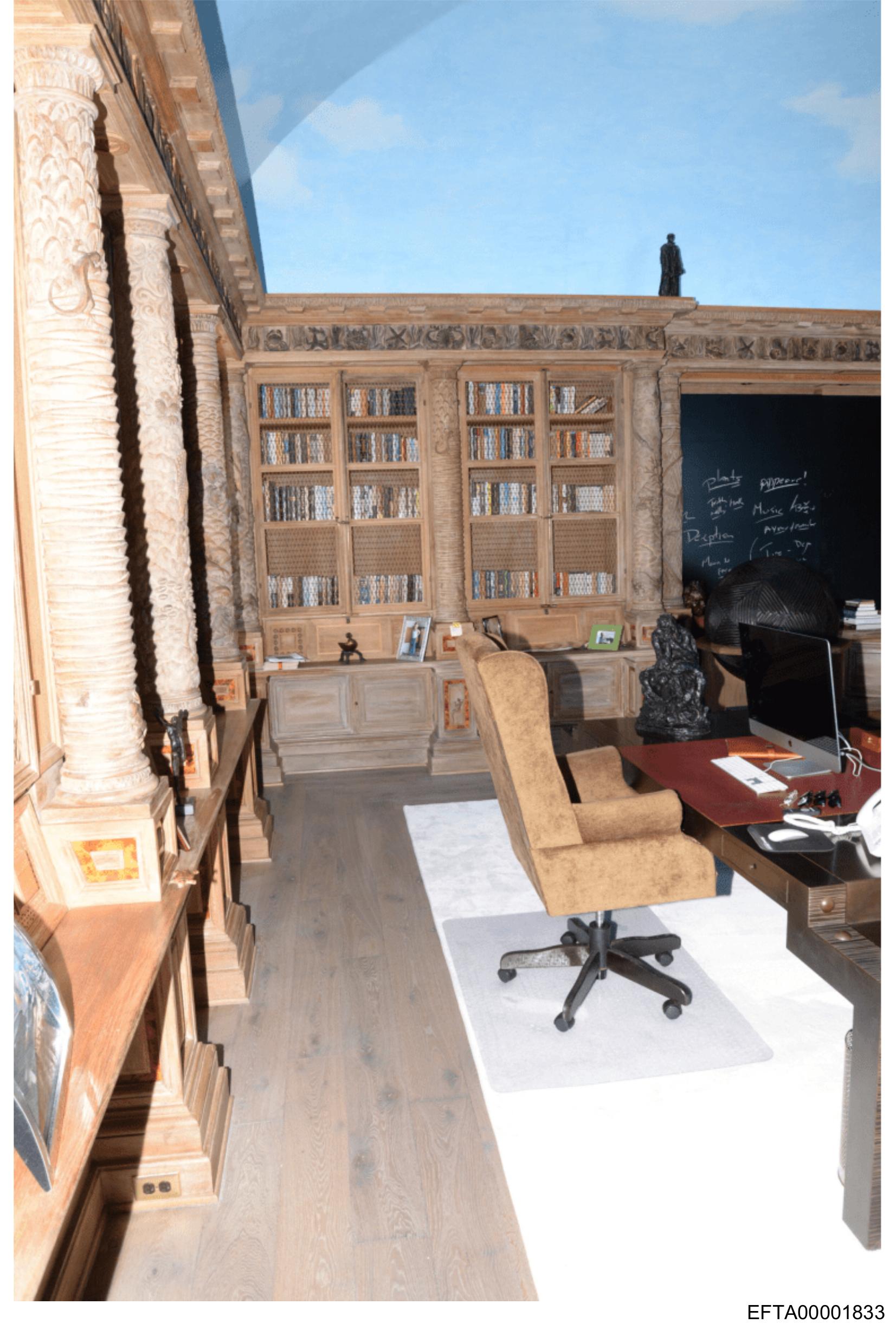 The image shows an office room with a traditional style. The walls are painted in a light color and feature decorative wall panels above a wainscoting of dark wood. To the left side, there is a tall wooden bookshelf filled with various books and objects. A desk sits in the center of the room with a computer monitor and other items on it, indicating that this space is used for work or study. In front of the desk, there's an office chair. On the wall, above the desk, there are notes and what appears to be mathematical equations written on a chalkboard, suggesting this might be a classroom or a space where someone works with mathematics. The overall atmosphere of the room is one of learning and academic pursuit.