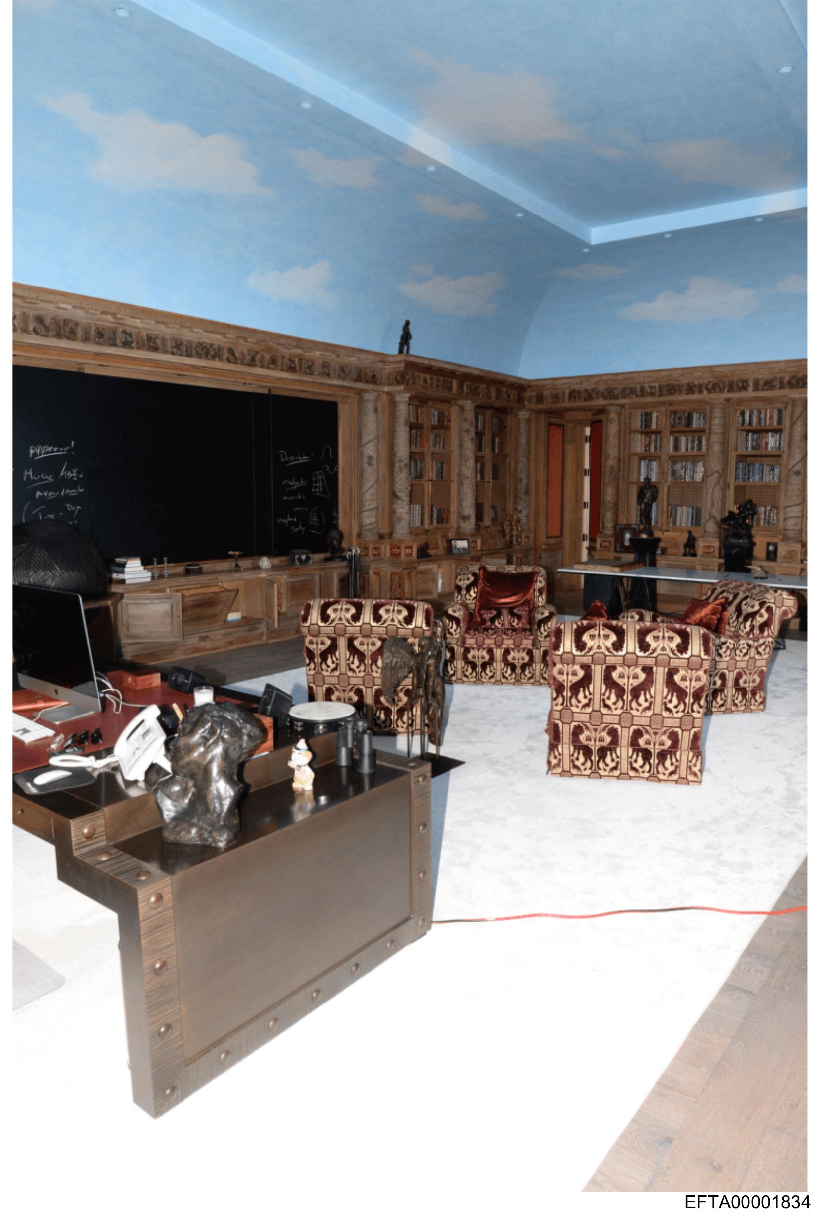 The image depicts an interior room that appears to be a traditional classroom or lecture hall. The ceiling is painted blue with white clouds, giving the impression of a sky. On the left side of the frame, there's a blackboard with writing on it; however, the text is not clearly legible from this angle. Below the blackboard, there are rows of desks covered in maroon-colored fabric, which could be intended to provide comfort or warmth for the users. The central feature of the room is an elaborate wooden paneling that spans the walls, featuring decorative carvings and a symmetrical design indicative of classical architecture. A fireplace with a mantelpiece is also visible on the right side of the image, further enhancing the traditional ambiance of the space. The flooring seems to be carpeted in a dark color, which complements the overall color scheme of the room. There are no visible texts or people in this particular image. The style of the photograph is candid and appears to have been taken without staging or professional lighting, as evidenced by the uneven illumination that casts shadows on some parts of the room.