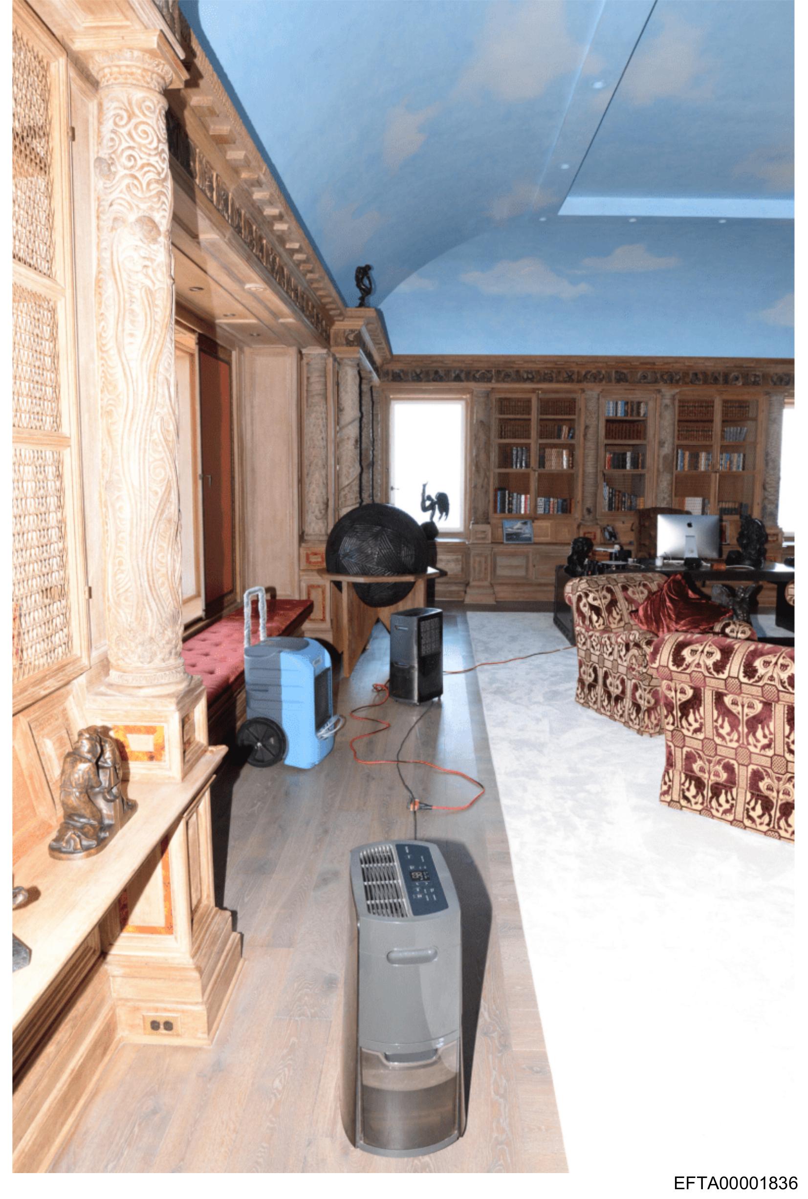 The image is an interior photograph of a room with a vintage or classical design. The ceiling has blue and white elements, possibly painted designs. In the foreground, there's a large fan on the floor. To the left, there is wooden furniture that includes a console table with decorative items and a larger piece of furniture behind it. On the right side, against the wall, there's a couch with an intricate pattern and cushions in shades of red and gold. There are no visible texts, people, or locations that can be discerned from this image. The photograph has a watermark at the bottom left corner with the text "ETG 0018".